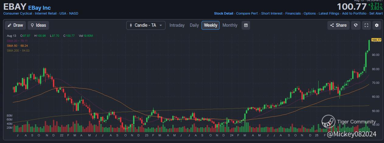 - Merle Ted·08-17Ebay is mature business seems to be in a class by itself. Branded. Strong cash flow. Modest shares out. Little dividend.LikeReport