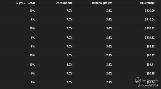 Valuation framing. Base-case FCF growth of 8–10% supports the current price; anything less requires a discount to today’s levels for an adequate margin of safety.