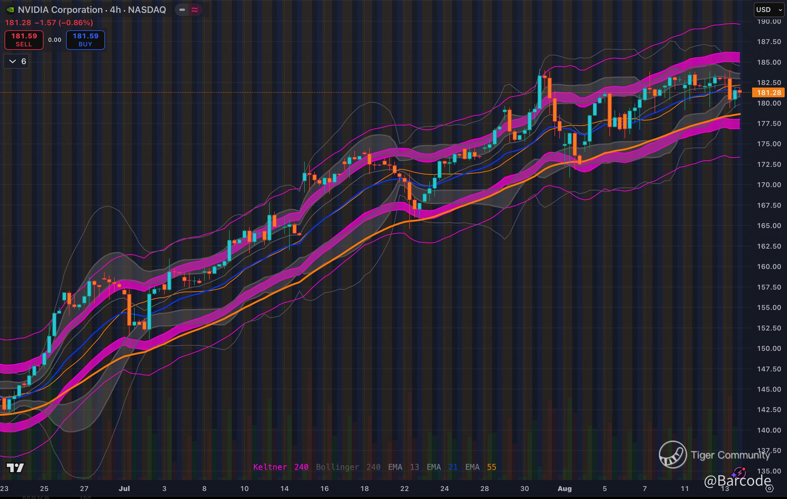 On the charts, $NVDAβs 4H is consolidating above the mid-Keltner band and 21 EMA after a powerful Julyβearly August rally. The upper Bollinger band flattens near 185, hinting at short-term digestion, while deeper trend support sits at the 55 EMA around 176. A clean reclaim of 183β184 could open the door to 185.50β187; losing 179.50 risks probing that 176 zone.