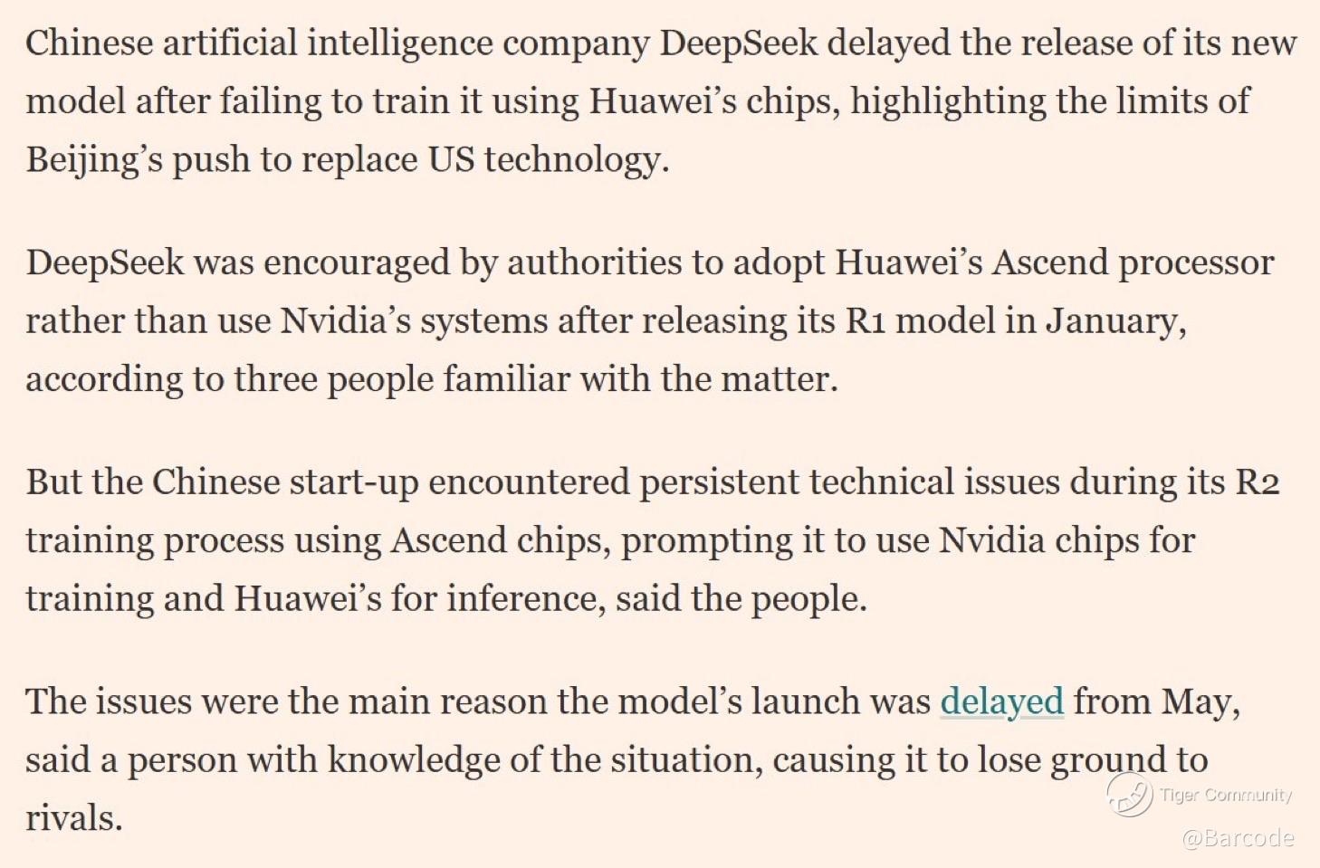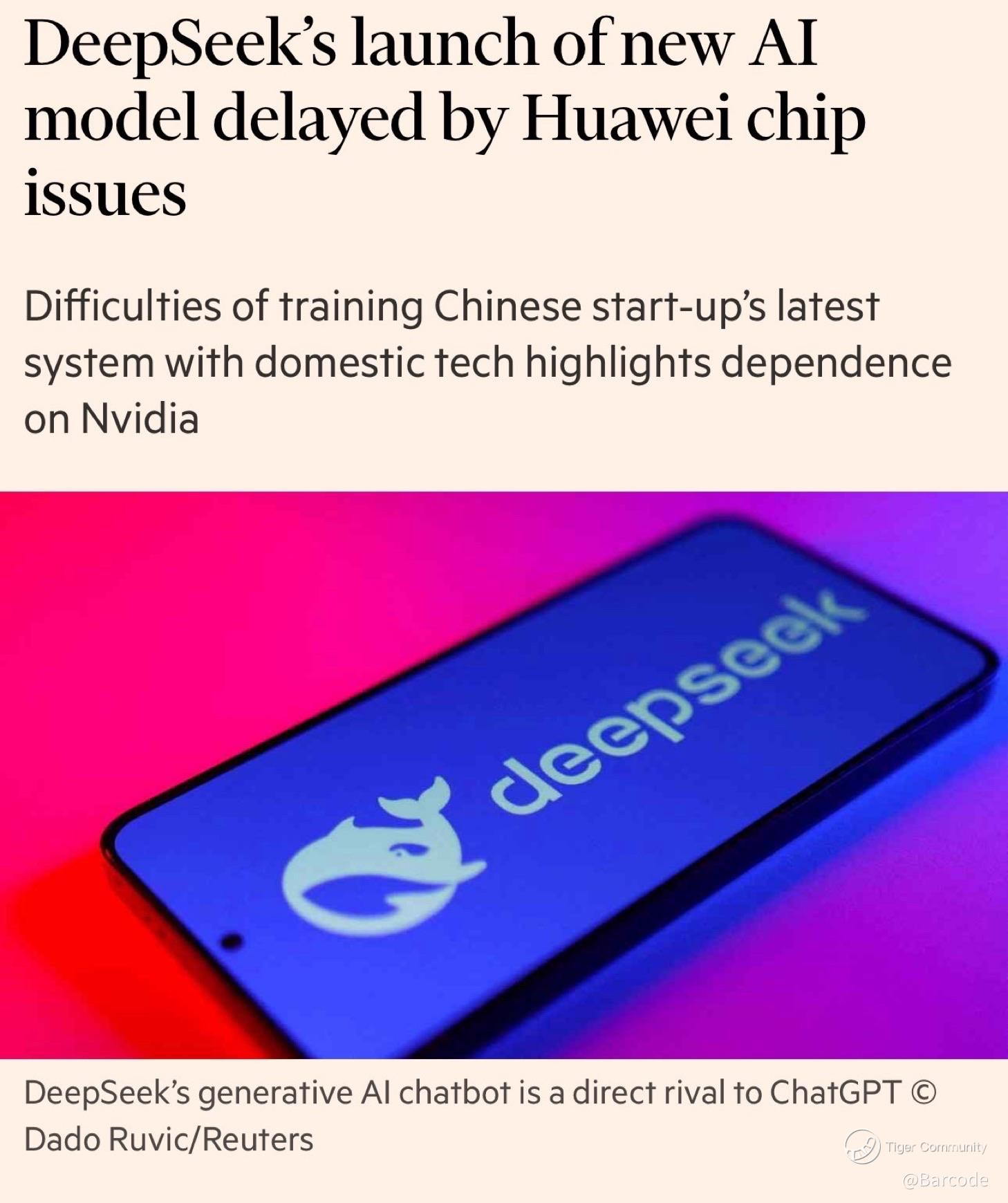 Iβm watching the DeepSeek news closely. Their highly anticipated R2 model has been delayed after persistent training failures on Huaweiβs Ascend chips. Engineers on site couldnβt resolve the issues, forcing DeepSeek to train entirely on Nvidiaβs H20 chips, with Ascend relegated to inference only. Thatβs not just a technical snag; itβs a clear statement on the current hierarchy of AI compute.