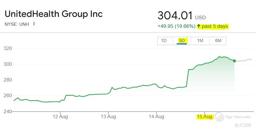 After news broke of his stake in UnitedHealth, the stock rose by +11.98% to close off Fri, 15 Aug 2025 at $304.01 per share. (see below)
