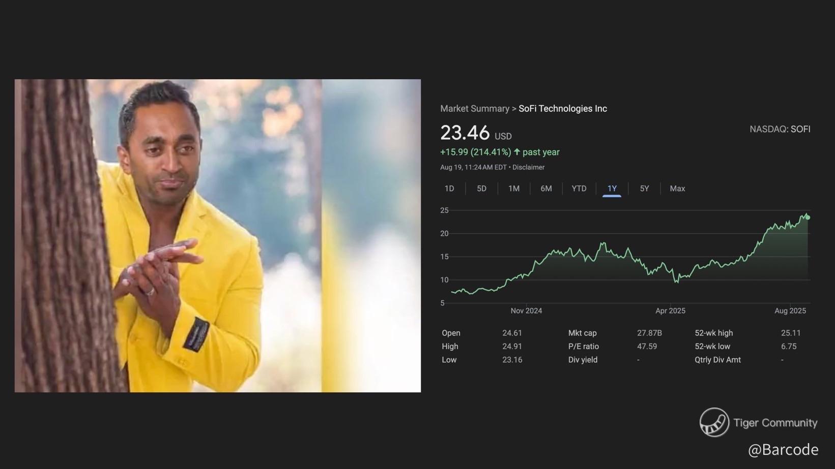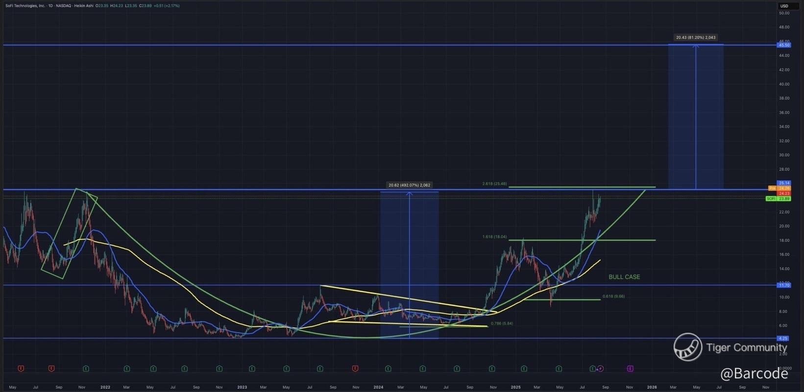 - Kiwi Tigress·08-20TOPWhat stood out for me is how you tied the Mexico rollout to that $65B remittance market because that’s not a side hustle, it’s a structural new revenue pool. I think people underestimate how powerful it is for $SOFI to be the only bank-chartered fintech layering Lightning on top of a regulated platform. The charts look like early $PLTR and it’s wild to see the same fib levels lining up, especially with that $25 level becoming the hinge point. That conviction around operating leverage plus a clear blockchain roadmap just screams re-rating story in progress1Report