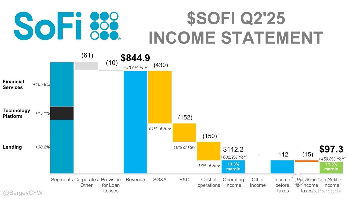 - Queengirlypops·08-20TOPThe income statement jump you highlighted made me stop and really look, that 459 percent net income growth isn’t just good optics, it’s the definition of operating leverage showing up. What’s underrated is how Financial Services revenue doubled and now scales faster than lending, that’s where the Lightning and wallet ecosystem will feed directly. I think you nailed it with the short interest setup because once that squeezes lower into sustained profits the market’s gonna have to revalue $SOFI like it did $PLTR. The $45 roadmap feels less like a stretch and more like a natural extension of execution.1Report