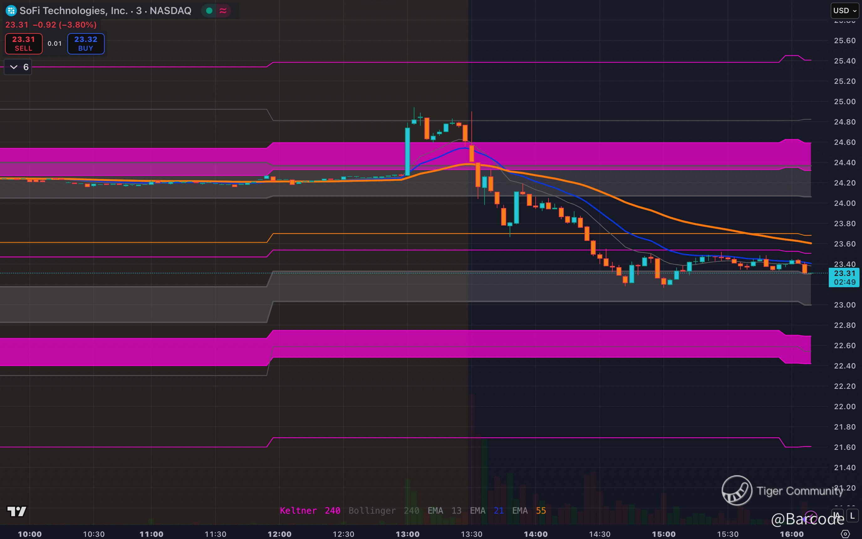 As is tradition, $SOFI dipped intraday on good news; the 3-minute view shows a spike into the supply band followed by a controlled fade toward rising intraday EMAs. I’m watching for acceptance back above that pink supply zone to confirm trend resumption. Volume expansion on the push and RSI leadership align with bullish control on higher timeframes.