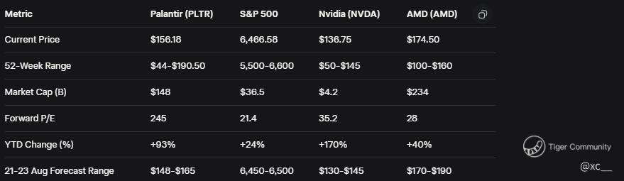 Valuation Metrics: At $156, Palantir trades at a 245x forward P/E, dwarfing the S&P 500's 21.4x and Microsoft's 30x, with a P/S of 32x suggesting premium pricing for its $4.15 billion 2025 revenue forecast.