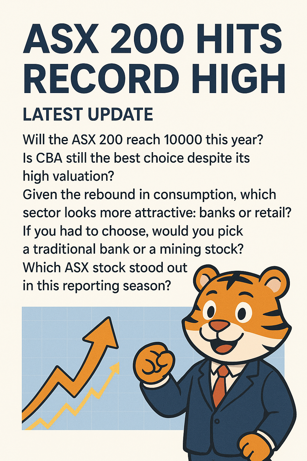 总结来看,我相信今年ASX有机会冲击10000点,但在高位需要注意短期回调风险。CBA股息稳定,但高估值让我更倾向于部分获利了结,转向消费股布局更具成长性板块。如果只能选一只,我会选择消费股,尤其是那些受益于消费复苏、财报业绩亮眼的公司,而不是传统银行或矿业股。这样既参与市场上涨,又能兼顾稳健和成长。