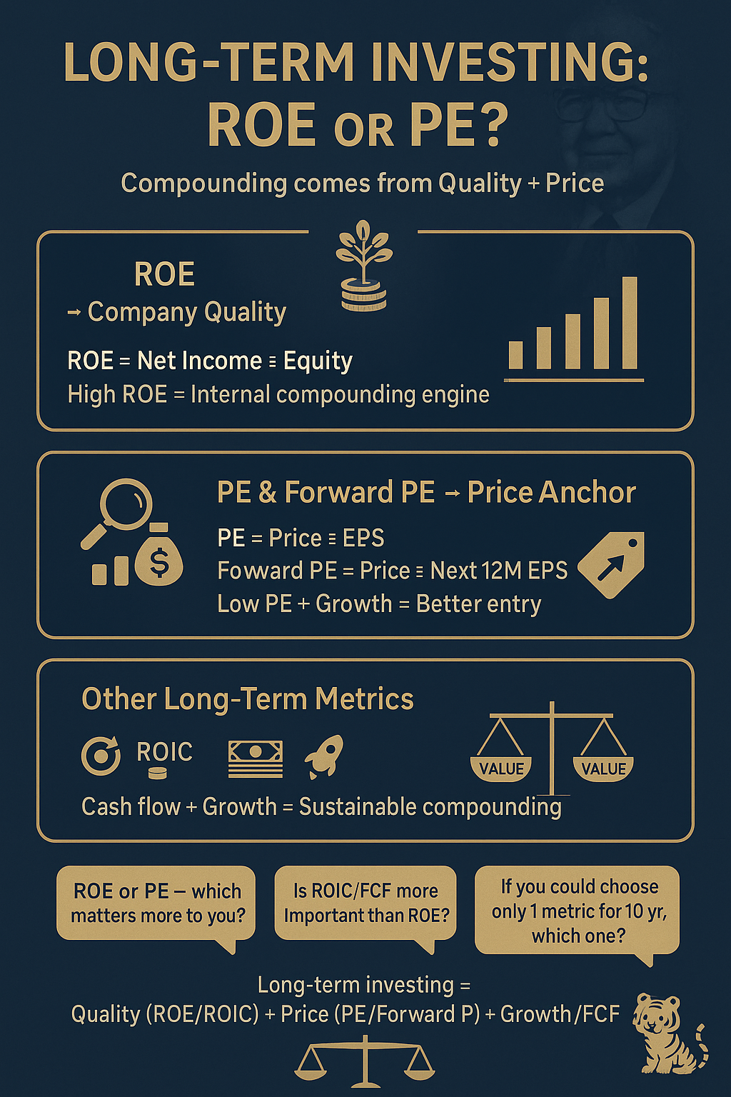 If I had to choose only one metric for a 10-year investment, I’d pick ROIC. It balances profitability with capital efficiency and avoids distortions from leverage. PE moves with sentiment, and ROE can be flattered, but high ROIC paired with steady cash flow growth gives me the most confidence in long-term compounding.