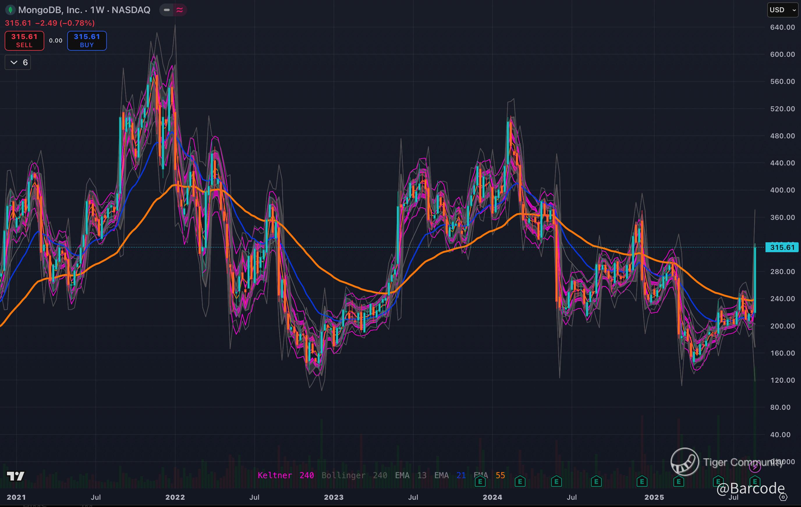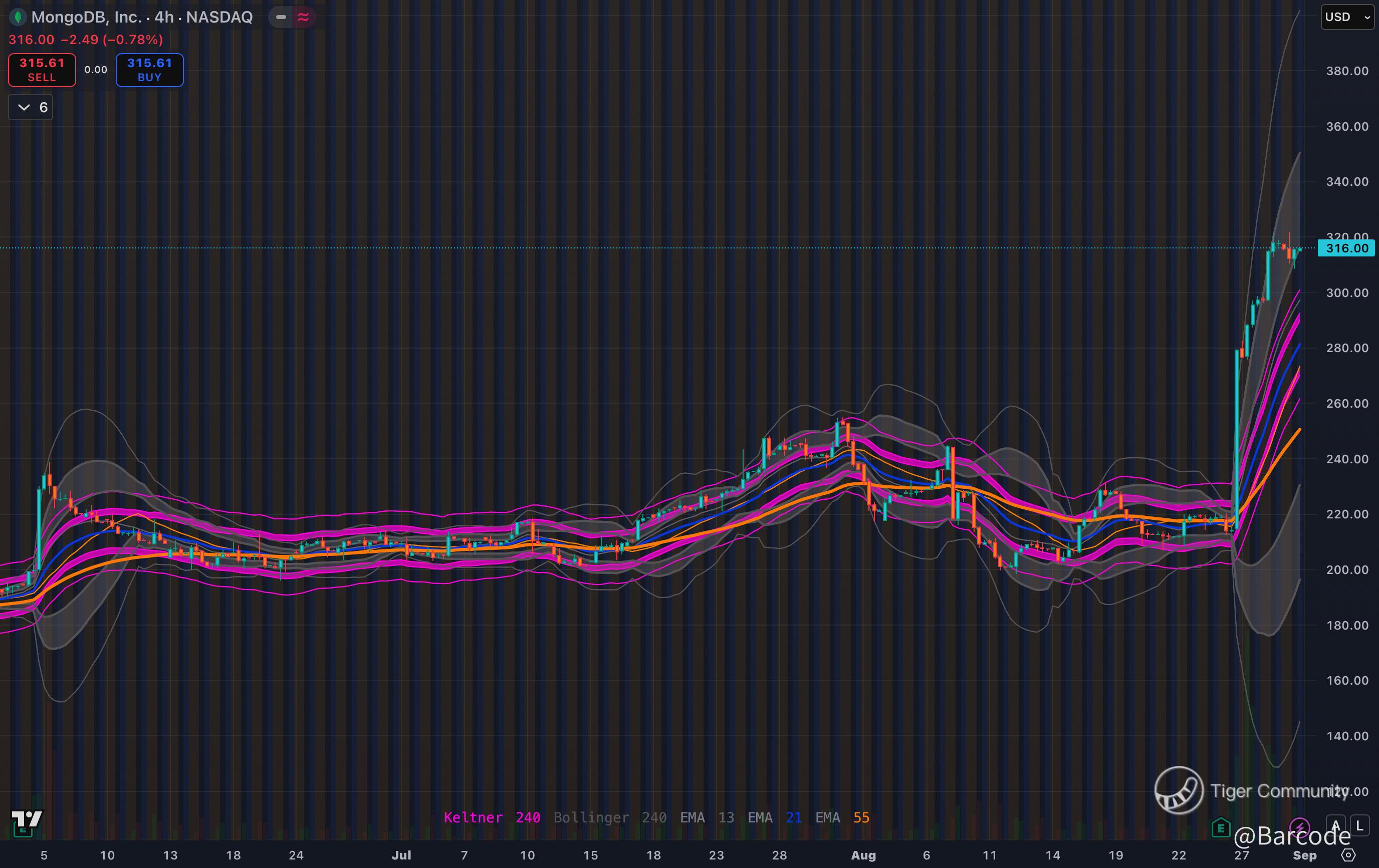 Iβm adding $MDB to my watchlist after a powerful reaction to earnings. Price surged straight through $300 and is holding near $316, confirming a major breakout. The $300 line now acts as a key retest level, with $275 as the earnings gap zone to monitor on any pullback. On both 4H and weekly charts, momentum is extreme and expanding outside of Keltner and Bollinger bands, signaling institutional conviction. MongoDBβs post-earnings breakout puts it firmly in play as one of my new favorites, and Iβll be tracking how price reacts to these key levels.