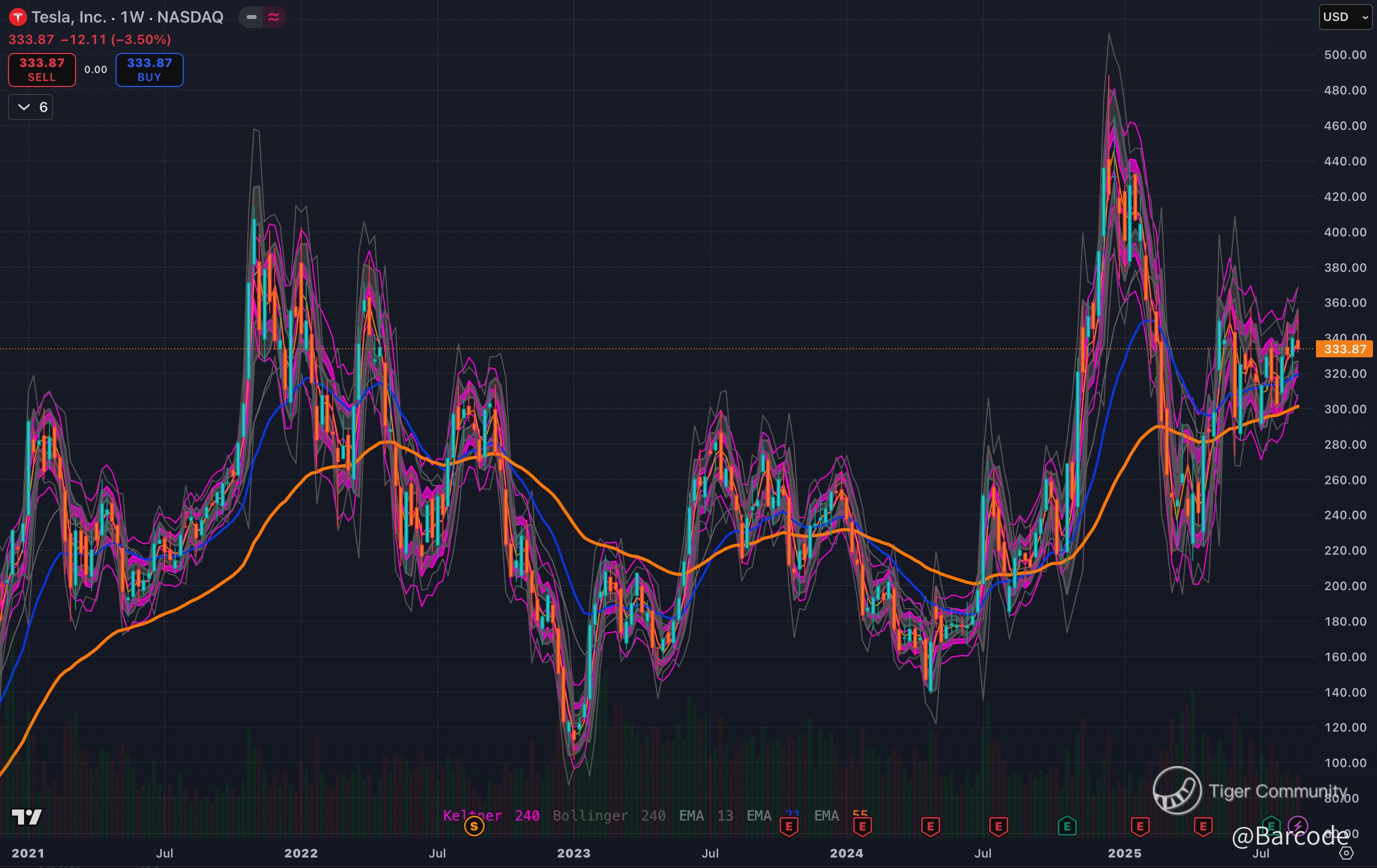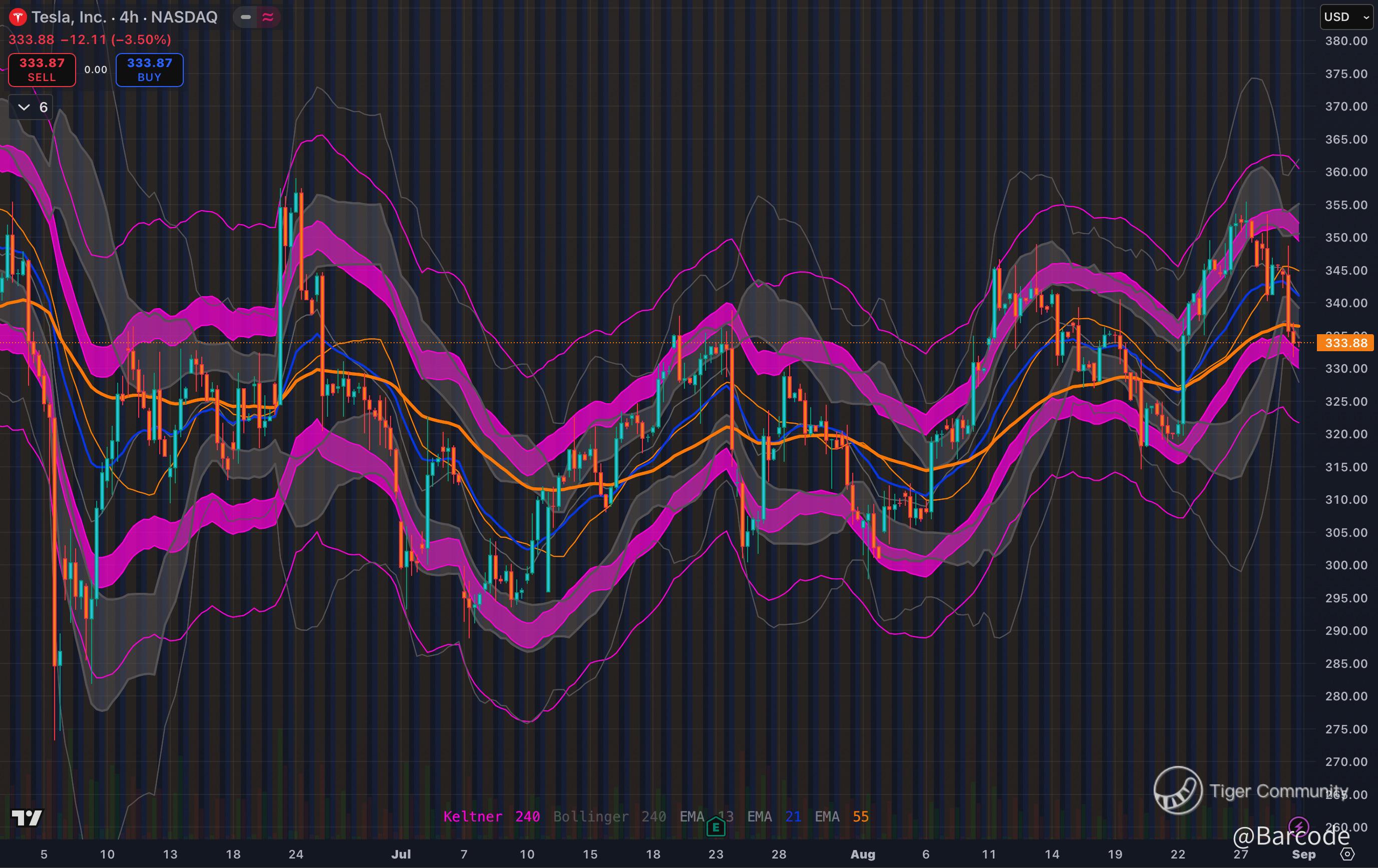 Iβm watching $TSLA closely as it presses on the neckline at $331. The head-and-shoulders structure is pressing against a critical pivot, and the charts are showing how important this line really is. On the 4H Keltner/Bollinger overlays, Tesla is leaning into the lower band with short-term EMAs curling down, adding pressure. A clean break would shift momentum toward $314.94 and $309.07, which are the next visible supports. Iβm noting that on the weekly chart Tesla is still above the 200W EMA, so while the short-term bias is weak, the long-term structure remains constructive. This is a key moment where bulls either reclaim $339.11 or risk a deeper slide inside the $350β$300 box.
