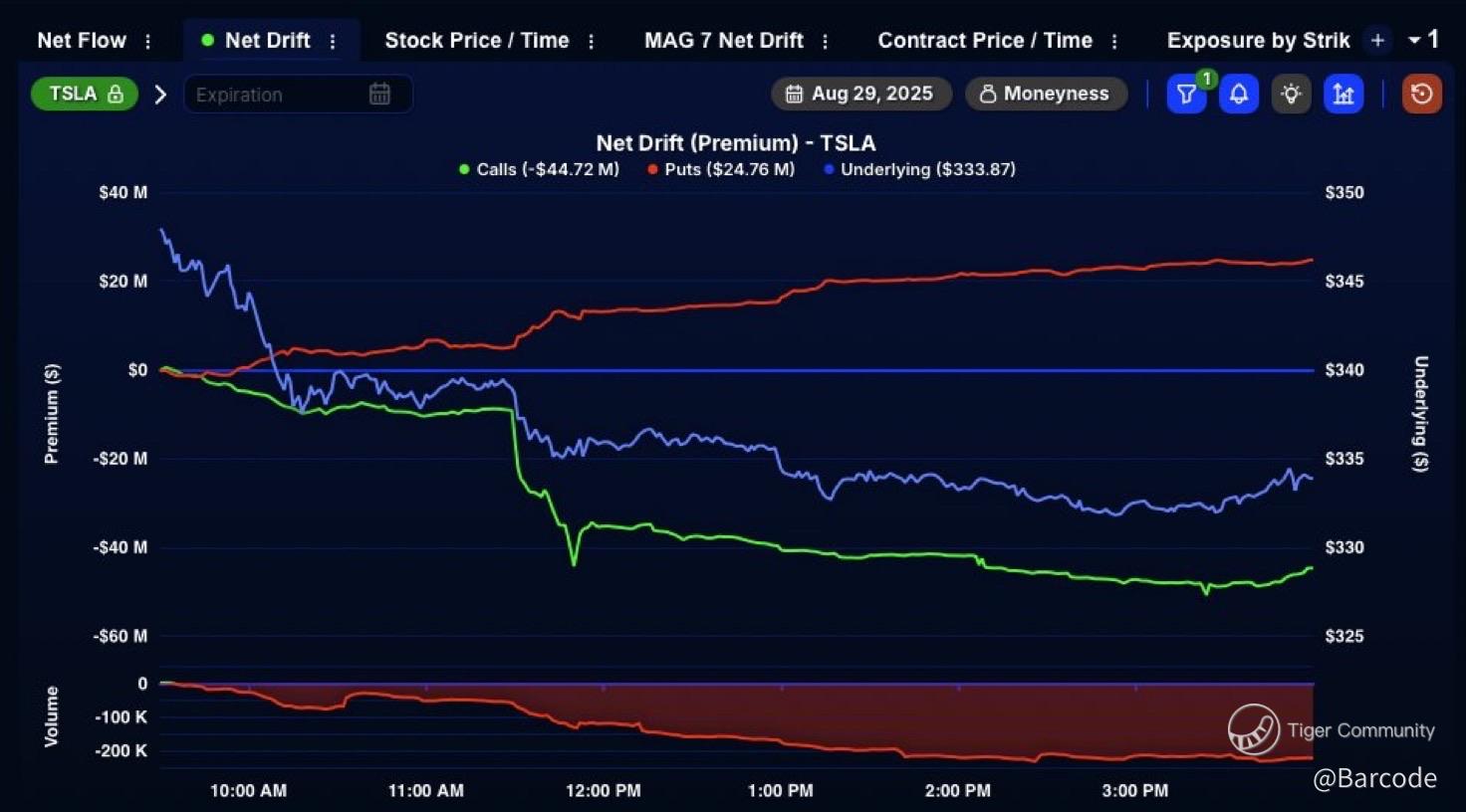 Over $44M+ in single-leg, β€90DTE calls were sold on $TSLA today alongside $24M+ in puts bought. Price fell more than $12, or 3.5% intraday. That positioning shift highlights how aggressively traders leaned bearish into todayβs tape, reinforcing the neckline pressure.