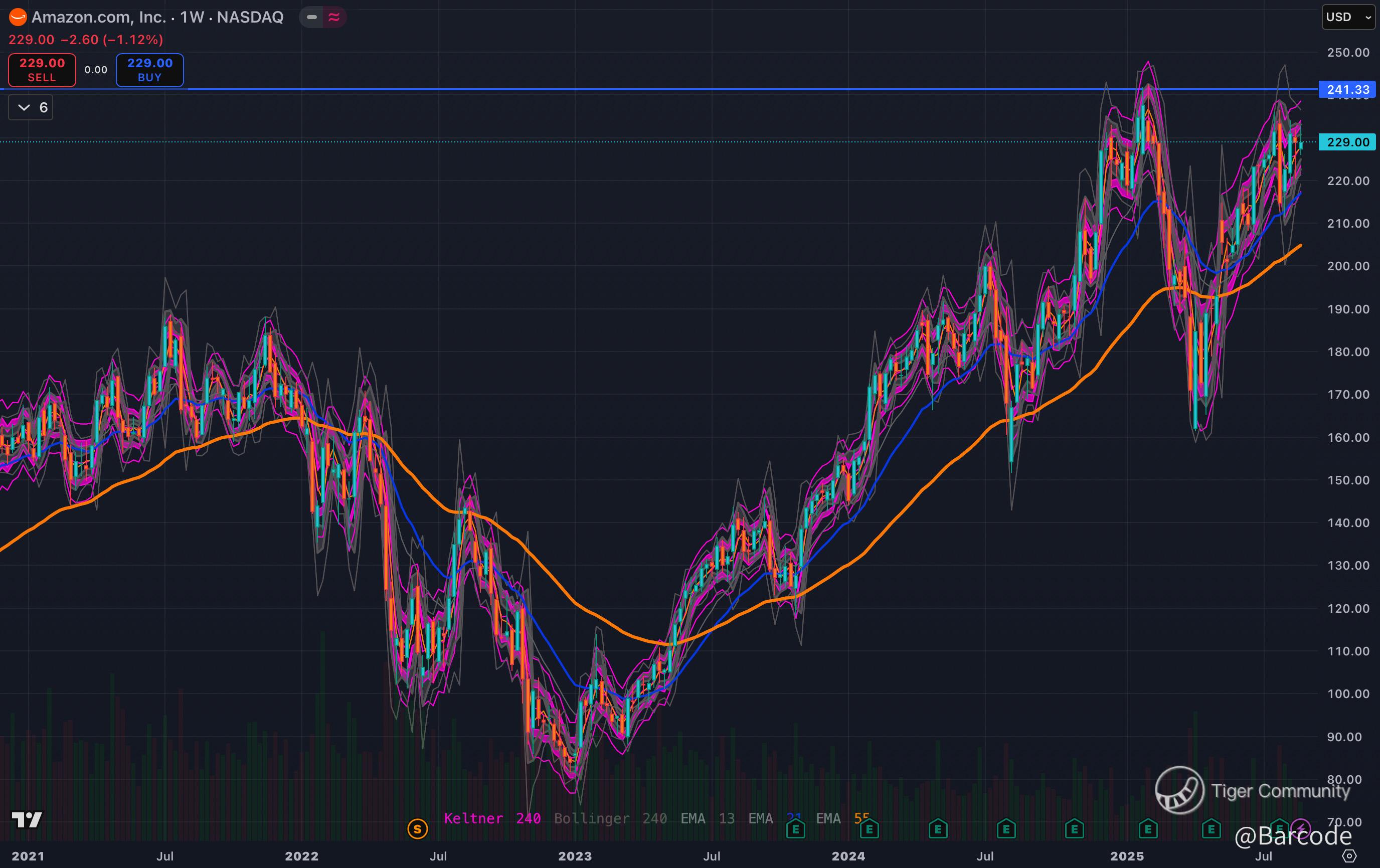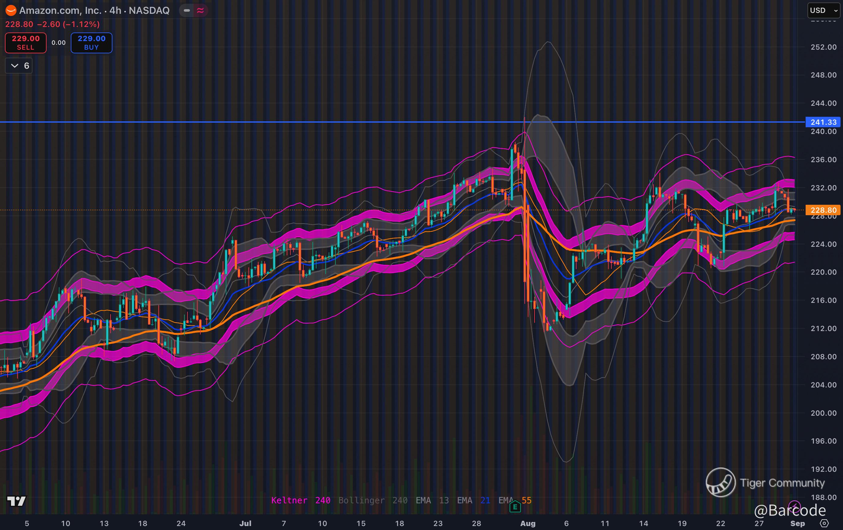 Iβm watching $AMZN for a possible inverse head-and-shoulders pattern thatβs tightening on the daily. The right shoulder is holding trend and price is pressing into resistance. The $231.20 level is crucial; if it holds, the pattern remains intact. A breakout above $234β$235 would be the trigger, opening the door to $237.85 and even $246.40 above. On the 4H and weekly Keltner/Bollinger bands, volatility is tightening, which often precedes a directional breakout. Compared with Teslaβs breakdown risk, Amazonβs structure is setting up as a potential upside move, with a clean risk-reward profile around that $231 line.