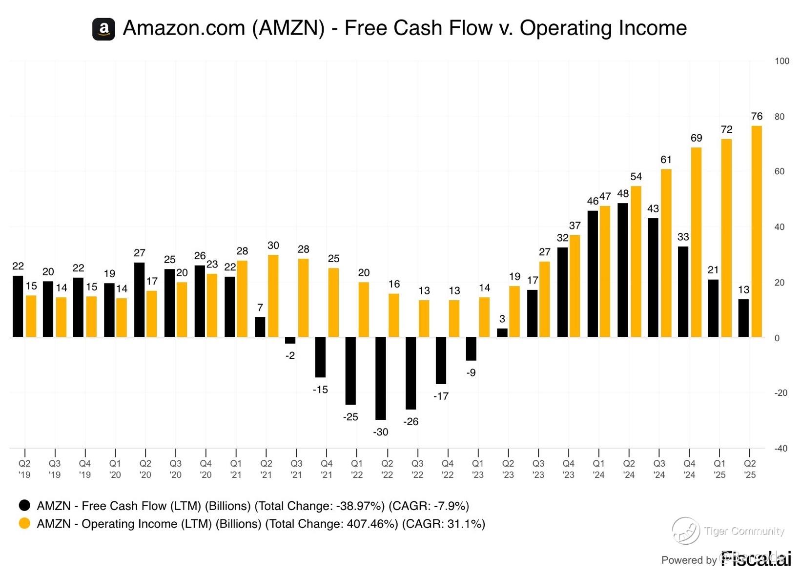 Amazon has never had a wider spread between free cash flow and operating income. Operating income has surged more than 400% since 2019, while free cash flow remains negative on a trailing basis. This divergence highlights both the heavy reinvestment cycle and the potential leverage if capex normalizes. Itβs a crucial backdrop for why $231.20 must hold; a breakout from the technical setup could align with improving capital efficiency.