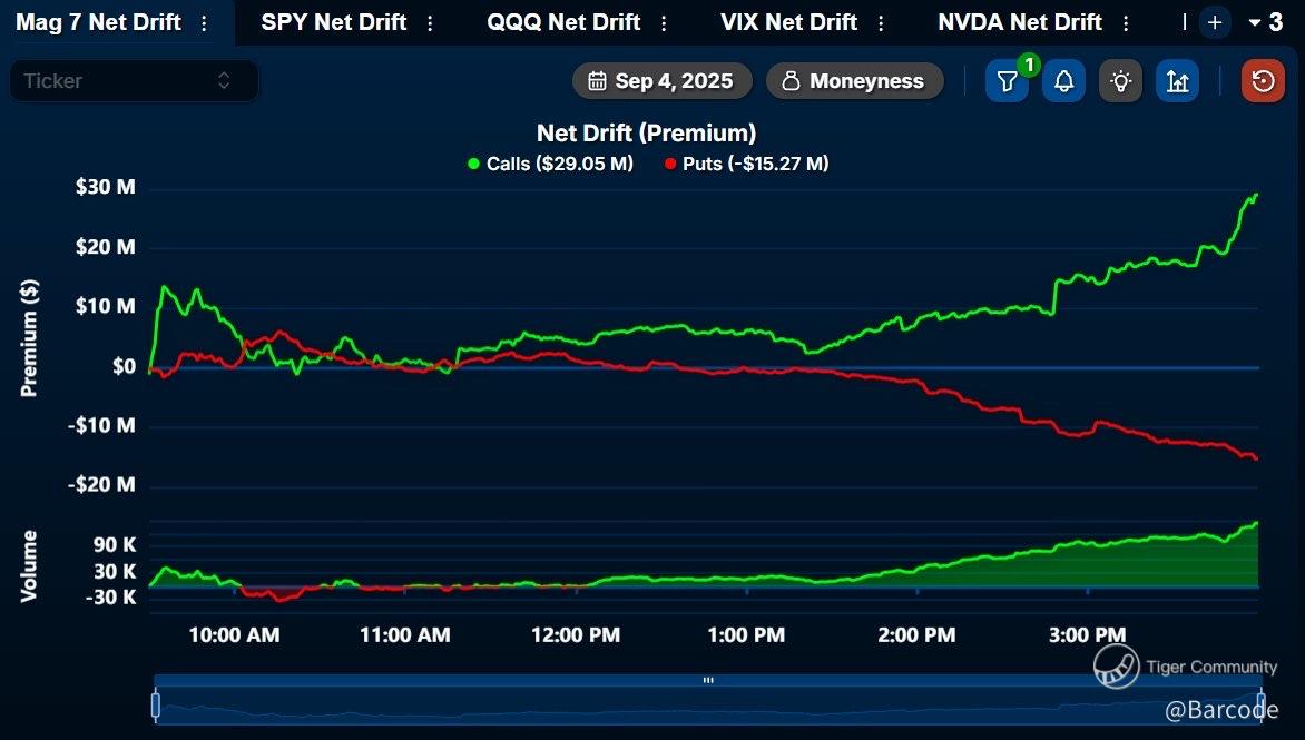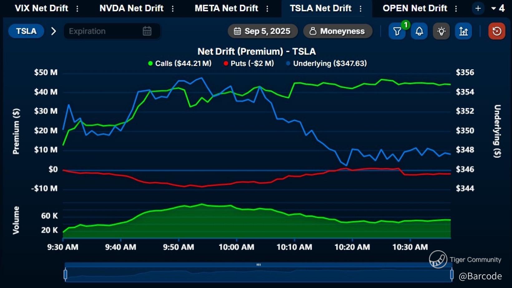 The options tape flagged $44M of net call buying in $TSLA today versus limited net puts; Friday also saw roughly $29M of net calls across the Mag 7. My net-drift tool shows persistent call premium while the underlying sat near $347.63.