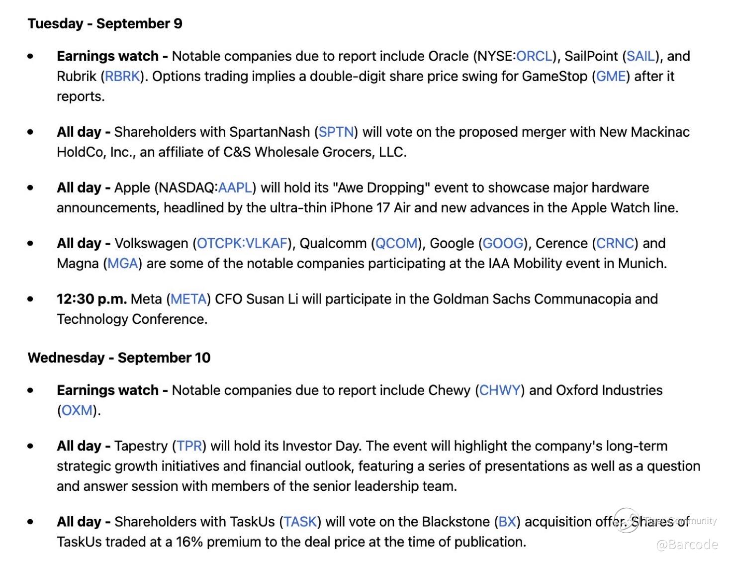 Tuesday 09Sep25: Appleβs iPhone 17 event. Hardware reveals often reset supplier sentiment and index microstructure; any ASP uplift or AI edge will flow through to $AAPL weight in $QQQ.