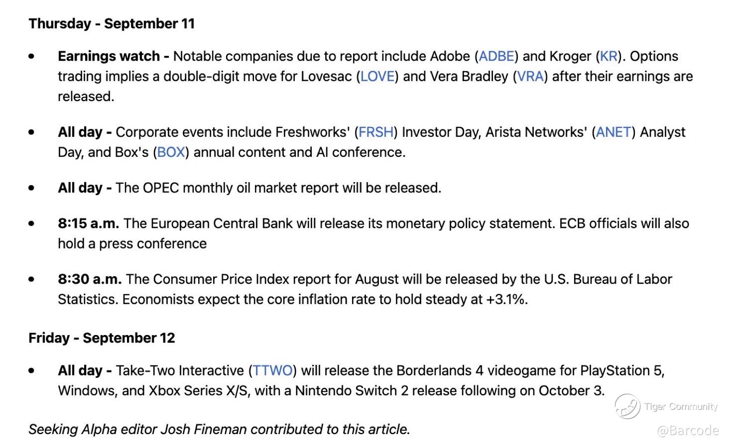 Thursday 11Sep25: US CPI at 8:30 a.m. ET, Jobless Claims at 8:30 a.m. ET, plus the ECB decision and press conference earlier in the morning.