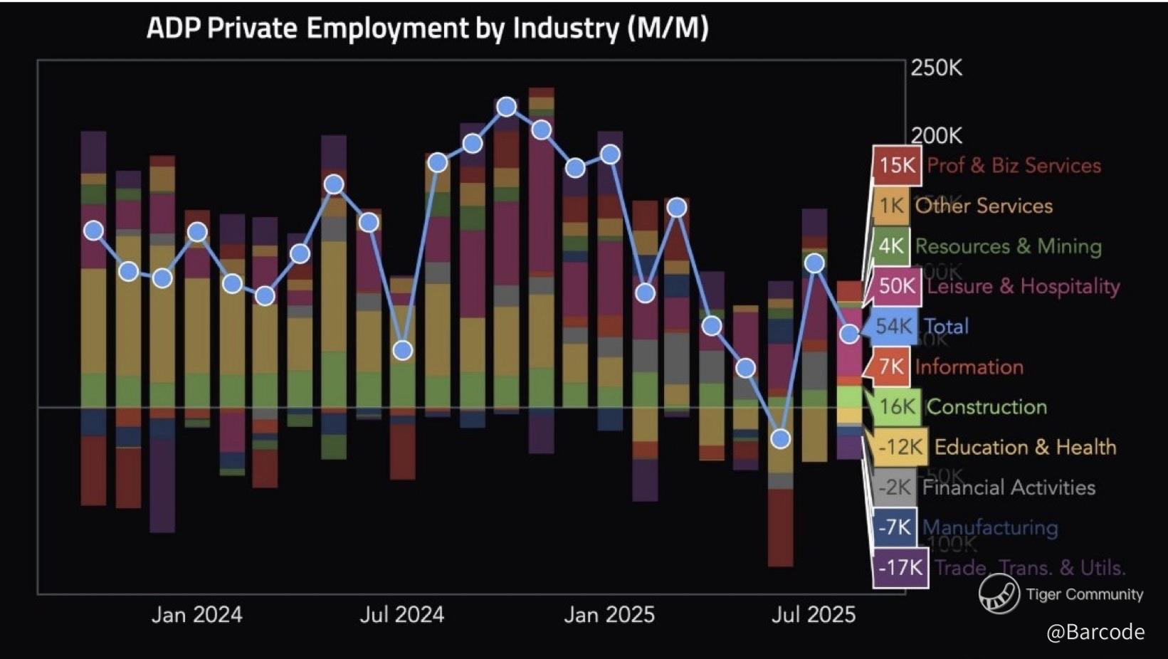 ADP printed 54k for August, well under 65k consensus and far below Julyβs 106k. That cools the cyclical heat; it also sets a lower bar for CPI optics.