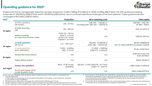 Also, the South African gold operations generated their highest adjusted EBITDA since H2 2020, according to the post-earnings commentary, so now it's ~48% of the group's consolidated EBITDA (vs. 33% last year). On this front, we see from the updated guidance that SBSW is planning to mine 15,000-16,000 kg from SA gold operations alone for the full 2025, and the cost discipline should stay generally in solid shape at $2,473-2,643/oz.