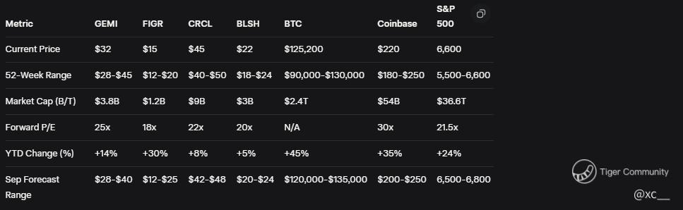 On September 13, 2025, crypto IPOs are stealing the spotlight, with FIGR up 30% and GEMI up 14% this week. Gemini’s $425 million raise and FIGR’s $300 million debut fuel a $5 billion sector boost. Bitcoin at $125,200 and Ethereum at $4,500 underpin gains, while S&P 500 at 6,600 and Nasdaq at 22,200 ride the wave. A 15-20% upside to $36-$40 (GEMI) or $18-$20 (FIGR) is in play if crypto holds, with 2026 targets of $50 (GEMI, 56%) and $30 (FIGR, 100%) possible. A 10% dip to $28-$29 (GEMI) or $13-$14 (FIGR) looms if regulation tightens. The $1.2 billion institutional inflow suggests momentum—jump in or step back?