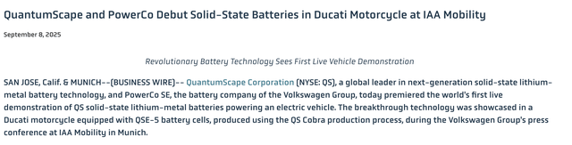 The first commercial product is via $Volkswagen AG(VWAGY)$ PowerCo SE and could see QuantumScape's batteries used in the technology stack of a Ducati motorcycle. The launch of the product would represent a mini-inflection point, as it would form one of the first anode-free solid-state batteries to be used in a commercial real-world setting. Volkswagen premiered the future product at a September press conference in Munich. When the motorcycle will launch is still in the air, with downstream sales unlikely to be material when considered against QuantumScape's current market cap.