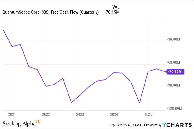QS also places its batteries ahead of the competition, with the space an intensely crowded field of established companies like $Samsung Electronics Co., Ltd.(SSNLF)$ and startups like $SES AI Corp(SES)$ and Factorial Energy. The key metrics to monitor for QS in lieu of revenue will be free cash flow (FCF) and short-term liquidity. FCF came in at negative $70.1 million during the second quarter, with the company's cash and cash equivalents at $800 million. Liquidity has dipped by 15% over QuantumScape's year-ago comp and was down by $63 million sequentially.