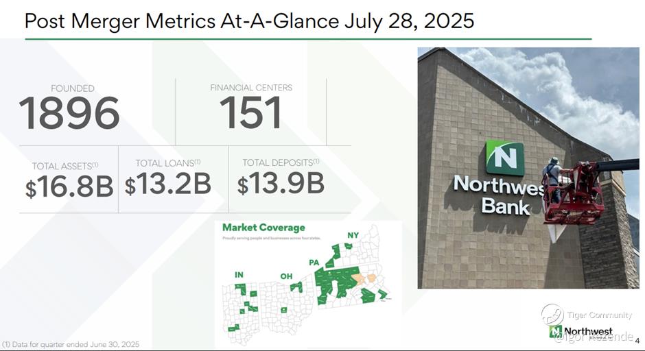 Completion of Penns Woods Bancorp acquisition, which will add 21 branch locations across North Central and Northeastern Pennsylvania after the consolidation. Northwest will operate 151 financial centers across Pennsylvania, New York, Ohio, and Indiana, with total assets of $16.8 billion. The total equity paid for the merger was $230 million, which was $30 million less than the equity consideration disclosed in the deal signed in December 2024.