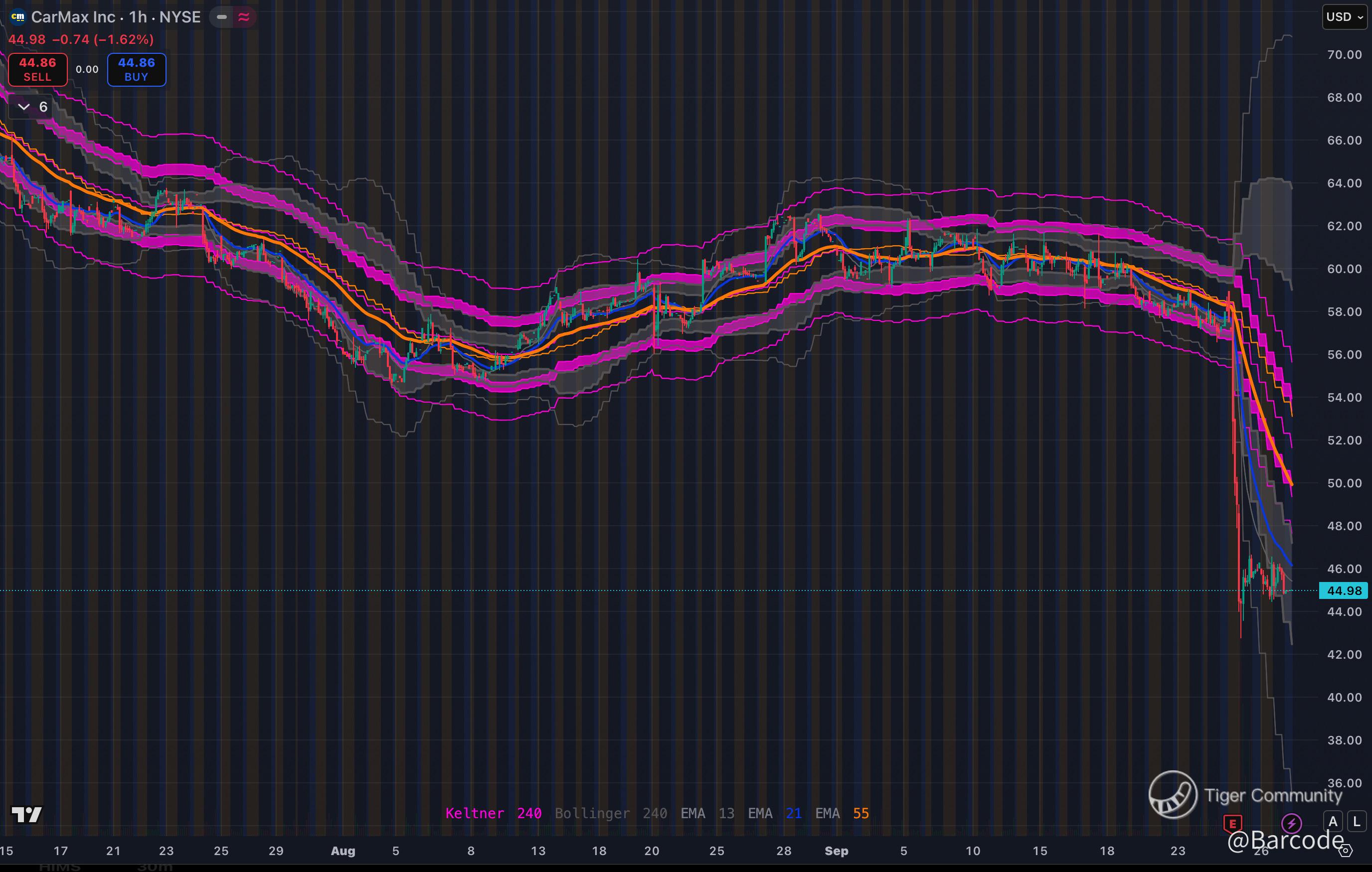 $CarMax(KMX)$ ๐ CarMax $KMX got smoked on earnings last week! But long-term support at $42-45 has held for a decade. Opportunities donโt just come in AI parabolas.