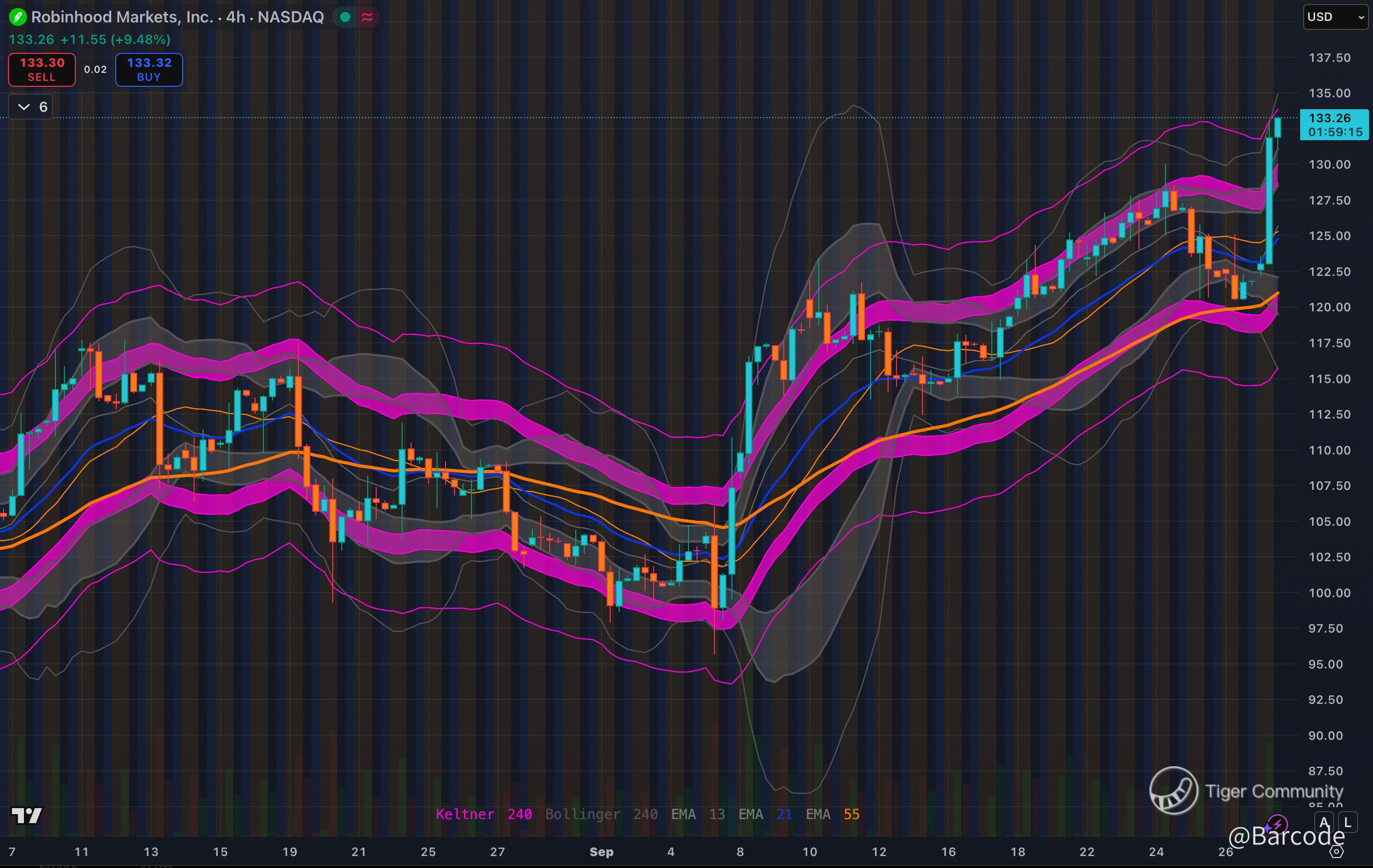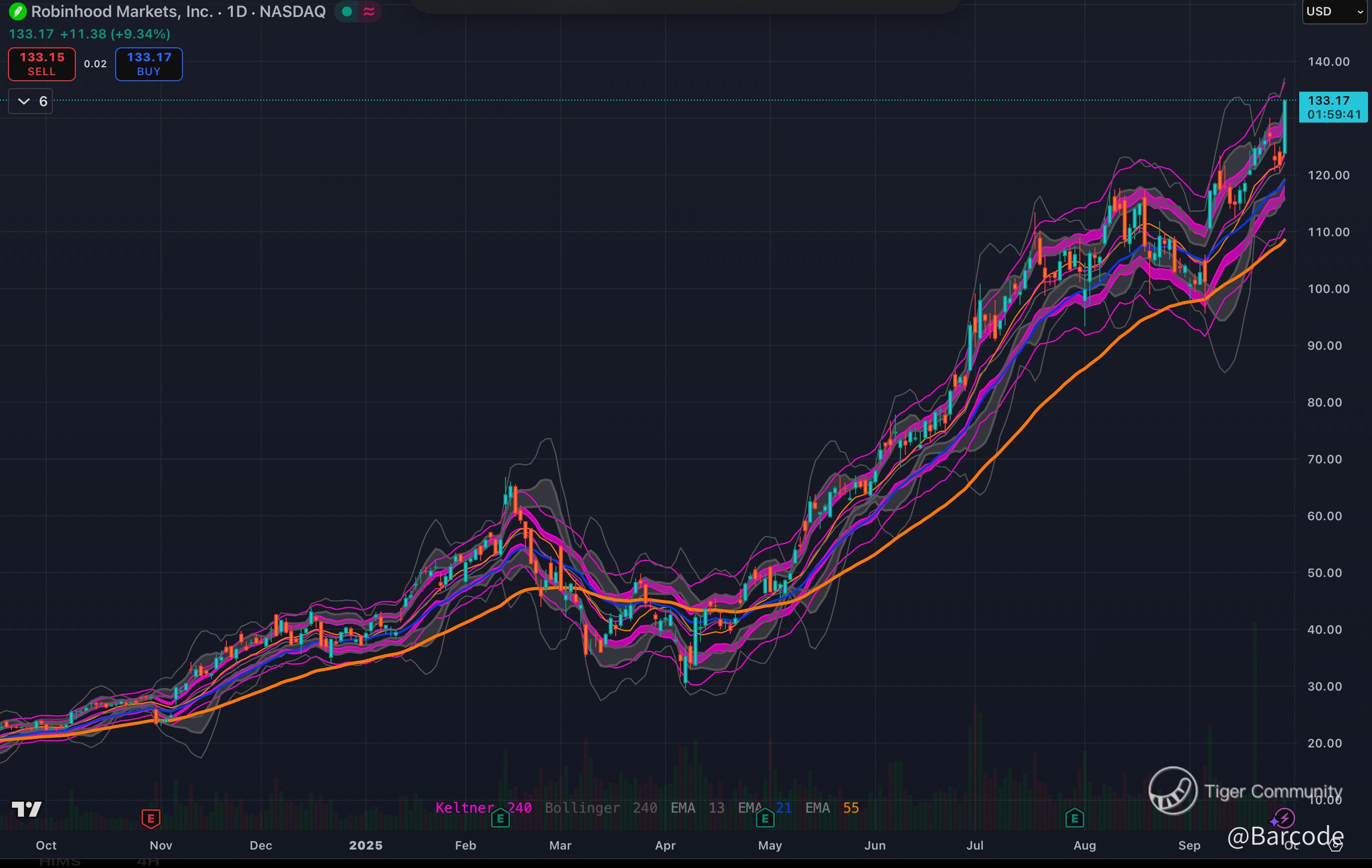 DL appreciate it. The growth story is now showing in the tape. After the gap we rode the upper Keltner and are stair stepping above the 13 and 21 EMAs. If pullbacks keep finding bids at 135 then 132 I’m modelling 141 then 144 as the next extension zone.
