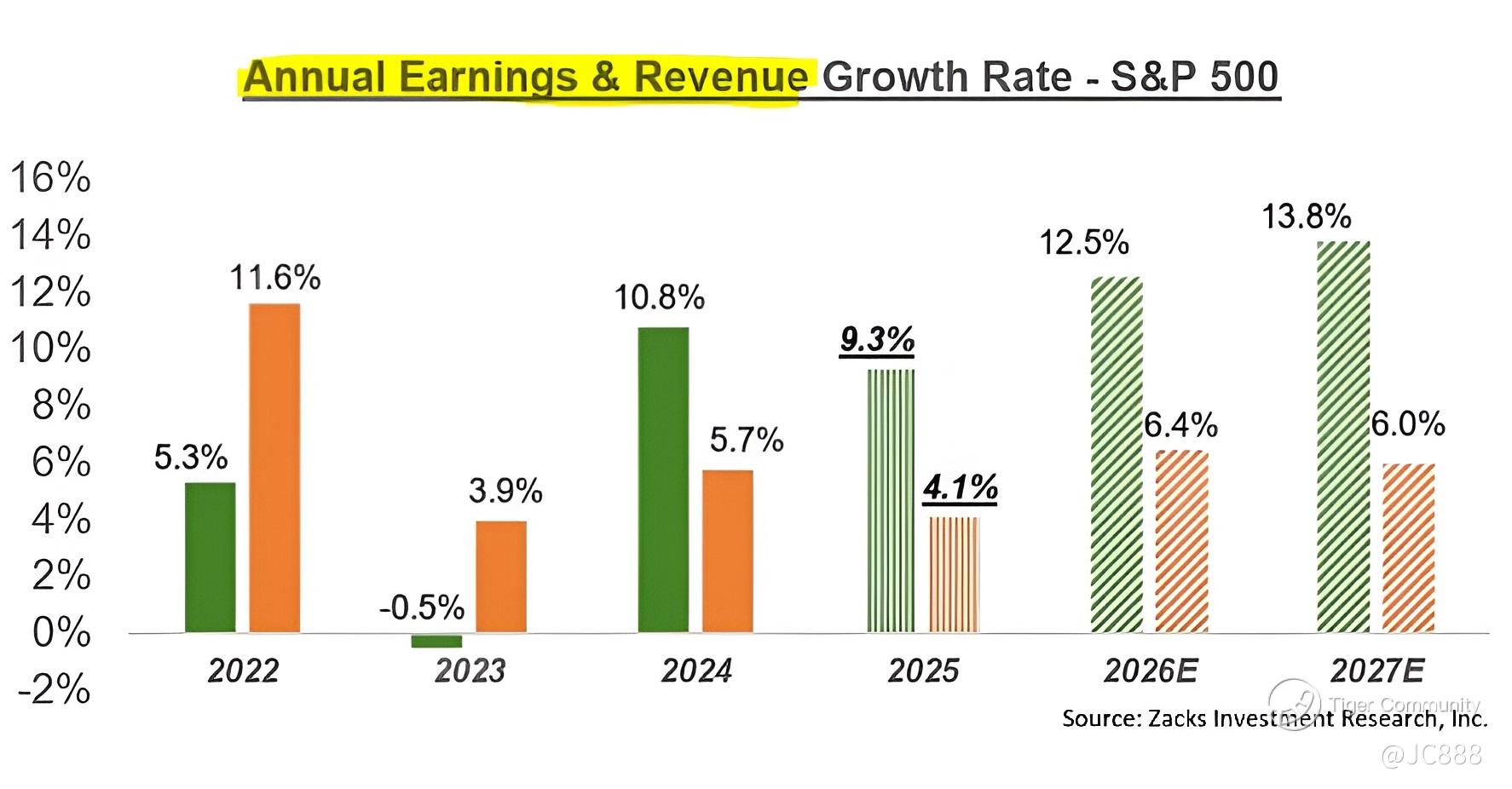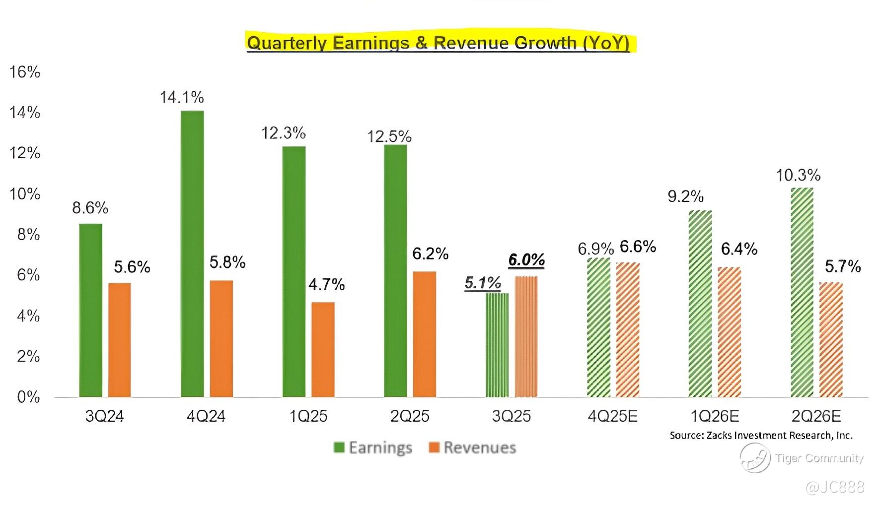 Q4 2025 is projected to be slightly stronger with earnings growth of +6.9% and revenues up +6.6%.