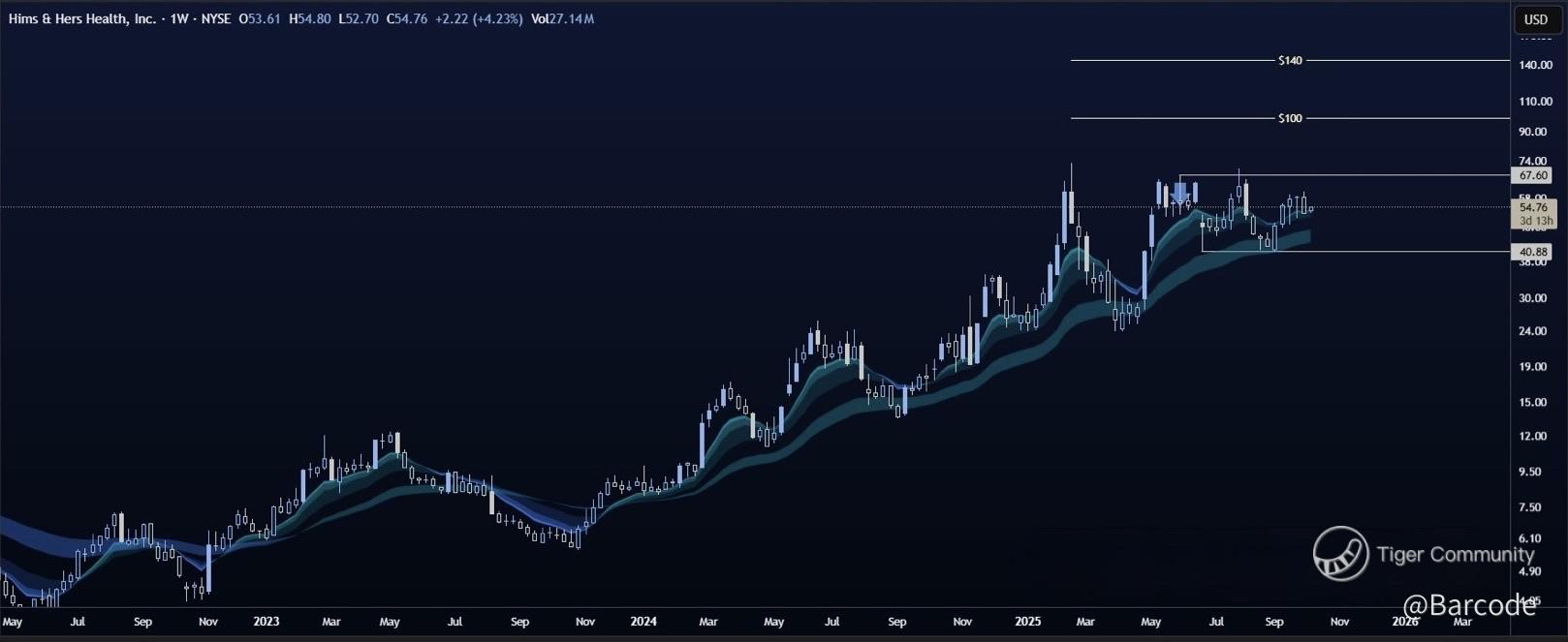 On the weekly chart, $HIMS is oscillating between 40.88 (key range floor) and 67.60 (ceiling). The real move happens on a decisive break above or below this range. Iโm not interested in noise within. A clean weekly close above 67.60 opens a measured-move target to $100, with stretch ambitions at $140. The 4H chart is showing price bouncing off the 55-EMA and piercing mid-Keltner bands, indicating a momentum re-acceleration phase.