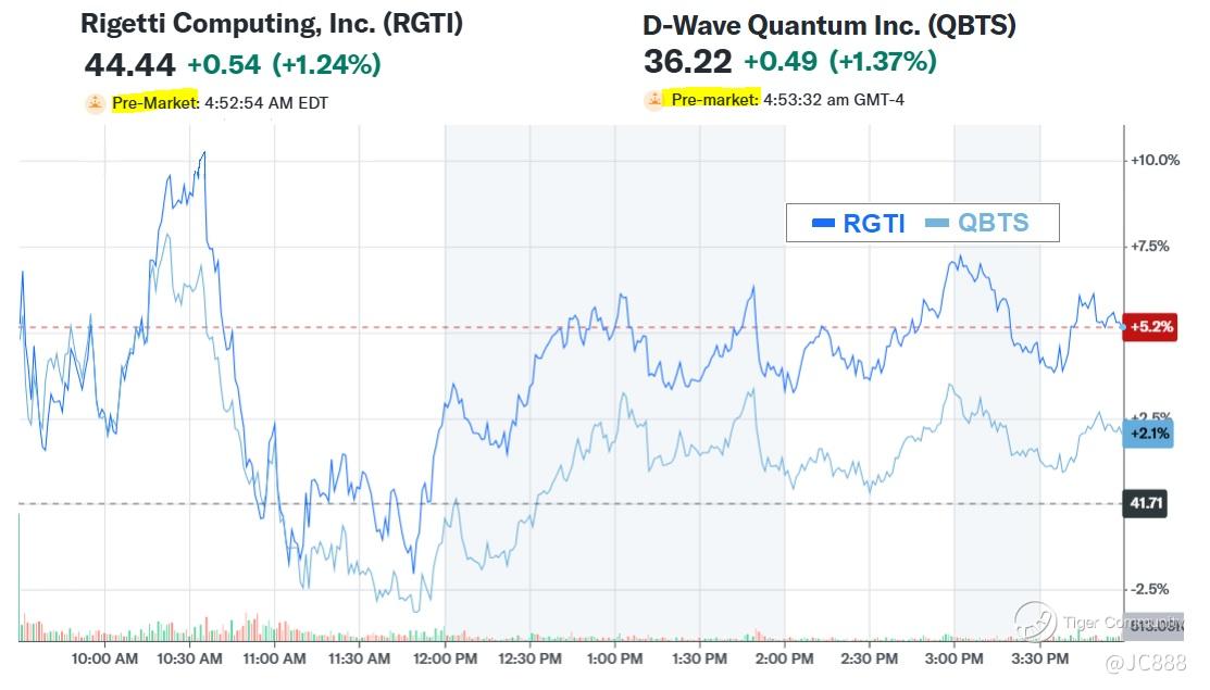 Shares of $Rigetti Computing(RGTI)$, $D-Wave Quantum Inc.(QBTS)$ and $Quantum Computing Inc.(QUBT)$ have surged more than +20%.