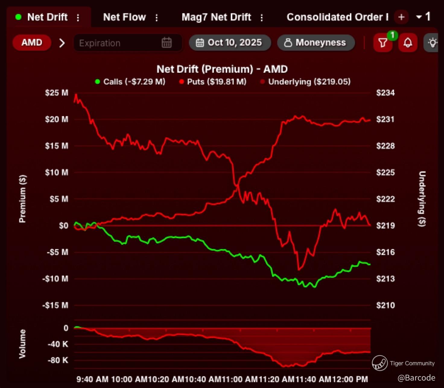 $Advanced Micro Devices(AMD)$ π Iβm watching $AMD lead the top unusually traded tickers today, down over $13 (β5%) as $19M+ in single-leg puts are bought alongside $7M+ in calls sold. The πΊπΈ stock market is on pace for its worst day since April!