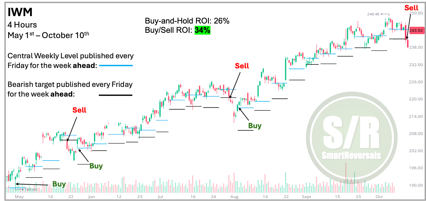 I have charted several securities analyzed in this publication during this week, incorporating the levels to demonstrate how a buy-and-hold strategy can be enhanced by initiating buys upon the recovery of the central weekly level and executing sells when that level is lost. I provide these levels weekly to manage risk, and charts like this one can be consistently validated against my Friday publications.