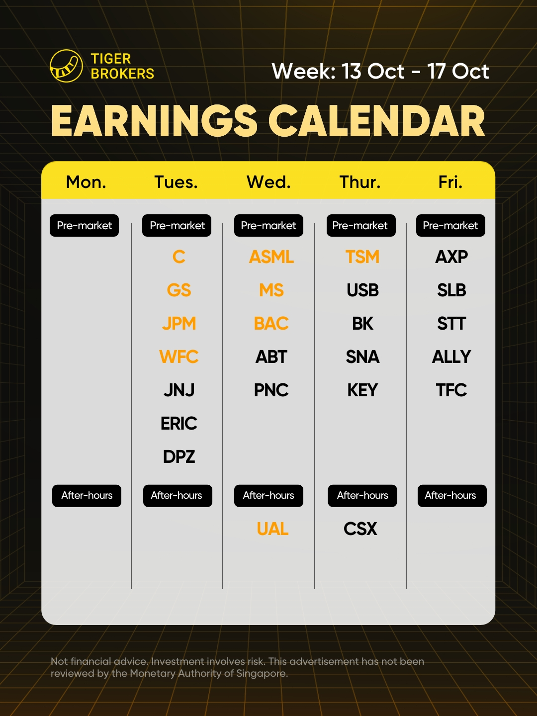 Outside of the financial services sector, big names to watch include Johnson & Johnson (JNJ) and Domino's (DPZ) on Tuesday and Taiwan Semiconductor Manufacturing (TSM) on Thursday.