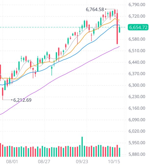 Candlestick chart of SPX index with green and red bars showing price movements from August 1 to October 15, overlaid with blue and purple trend lines, horizontal resistance lines at levels like 6700.00 and 6580.00, and a volume histogram at the bottom in green and red bars.