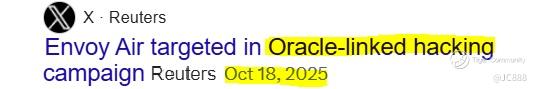 On Fri, 17 Oct 2025, ORCL confirmed that Envoy Air, $American Airlines(AAL)$' largest regional carrier, suffered a hack in recent days as part of the wave of extortion attempts from hackers exploiting ORCL’s E-Business Suite applications.