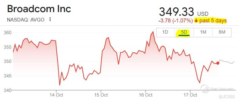 Unfortunately, it proved to be short-lived for the company because by Fri, 17 Oct 2025 - AVGO ended marginally lower than when it started the week. (see below)