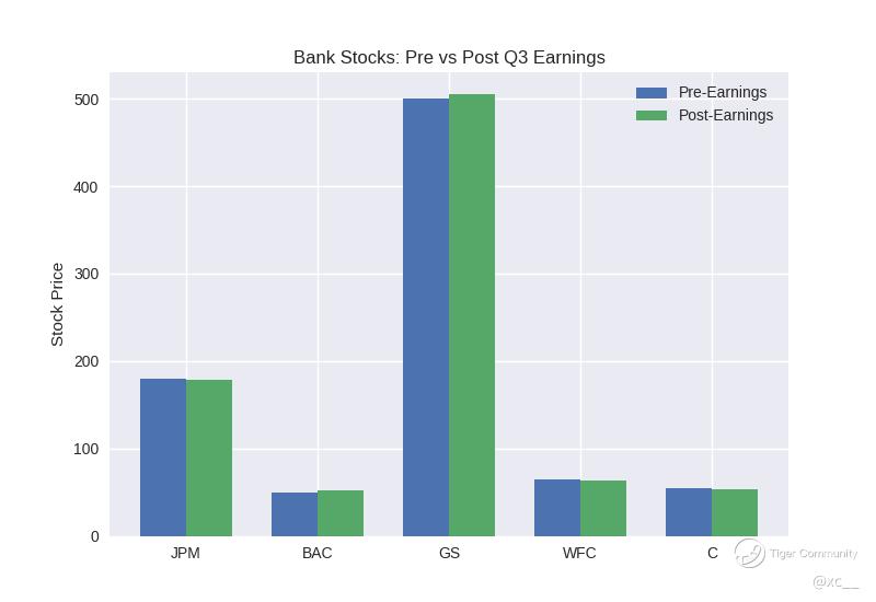 whip up this quick chart to track bank stock dips post-earnings ( plug in real prices for live tweaks):