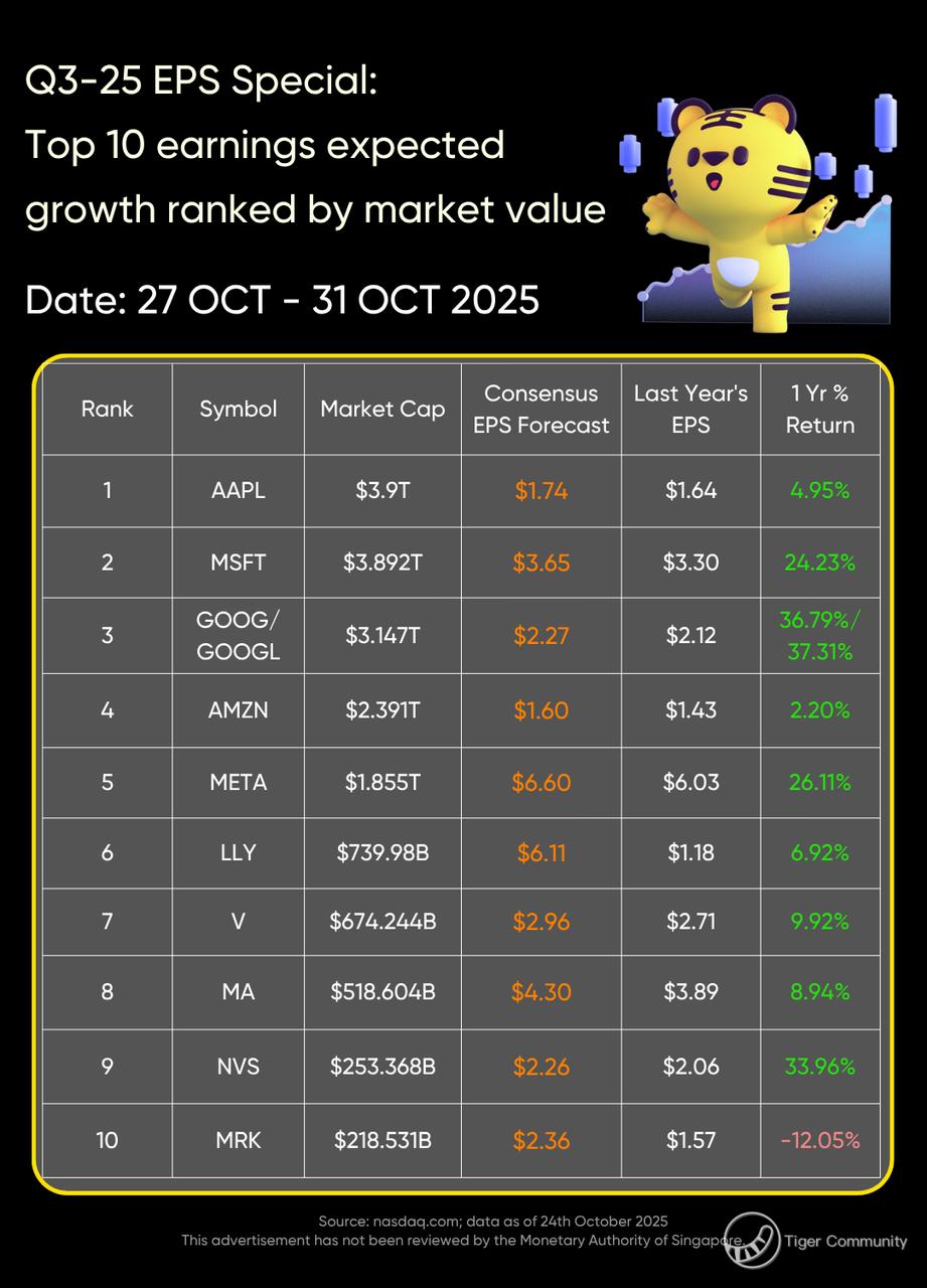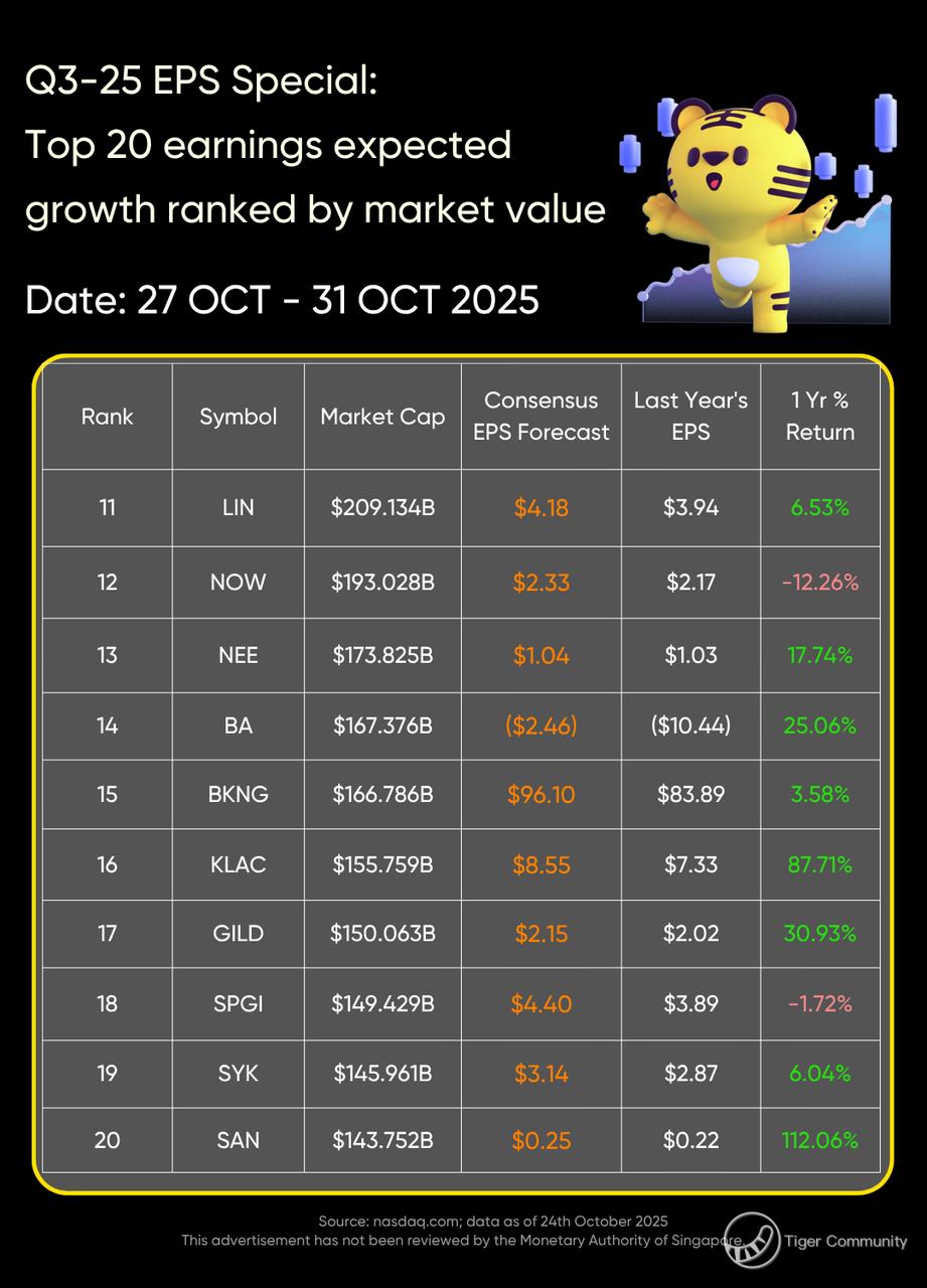 On October 27 to October 31, $Apple(AAPL)$, $Microsoft(MSFT)$, $Alphabet(GOOG)$, $Alphabet(GOOGL)$, $Amazon.com(AMZN)$, $Meta Platforms, Inc.(META)$, $Eli Lilly(LLY)$, $Visa(V)$, $MasterCard(MA)$, $Novartis AG(NVS)$, $Merck(MRK)$, $Linde PLC(LIN)$, $ServiceNow(NOW)$, $NextEra(NEE)$, $Boeing(BA)$, $Booking Holdings(BKNG)$, $KLA-Tencor(KLAC)$, $Gilead Sciences(GILD)$, $S&P Global(SPGI)$, $Stryker(SYK)$, and $Banco Santander SA(SAN)$ are expected to release their earnings, and consensus earnings per share forecasts are higher than data from the same period last year.