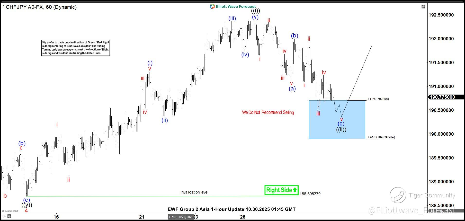 In this technical blog, we analyze the historical performance of the CHFJPY 1-hour Elliott Wave charts, as presented to members of ElliottWave-Forecast. The analysis highlights an impulsive rally that began from the October 15 low and concluded at the October 27 high, which surpassed the prior peak from October 8—signaling a potential bullish extension. Based on this development, we recommended that members avoid short positions on the yen cross and instead consider buying the dips in 3, 7, or 11 swing sequences within the designated blue box areas. The following sections will detail the wave structure and provide our updated forecast.