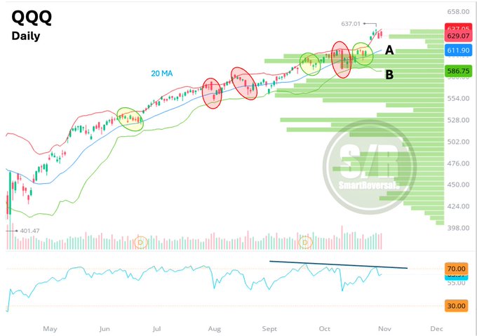 Stock chart for QQQ on a daily timeframe displays candlestick price action with green and red bars, overlaid by a blue 20-day moving average line, upper and lower Bollinger Bands in green, volume bars at the bottom in blue and orange, RSI indicator below showing divergence, and annotations labeling points A and B for retrace targets