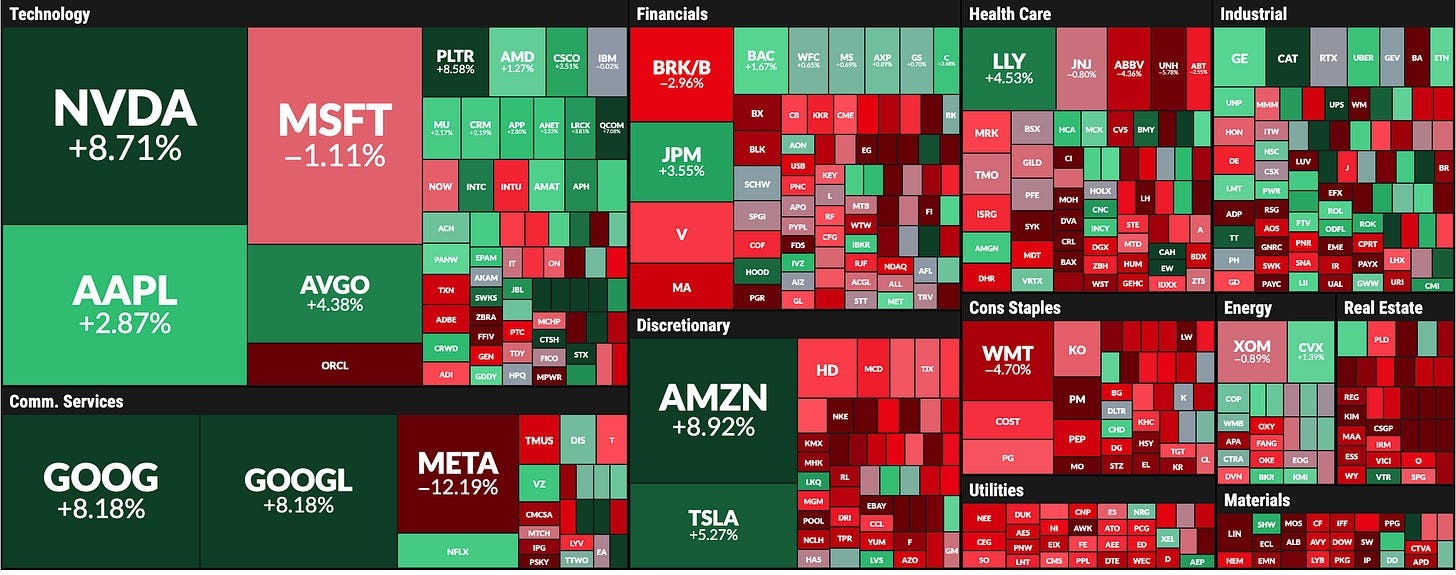 Conversely, two stocks failed to hold their ground: $Microsoft(MSFT)$ closed -1.1% for the week, and $Meta Platforms, Inc.(META)$ cratered -12.2%. Overall, from an earnings standpoint, the balance was positive, especially considering $NVIDIA(NVDA)$ and $Tesla Motors(TSLA)$ also rallied, as shown in the heatmap for the last five trading days: