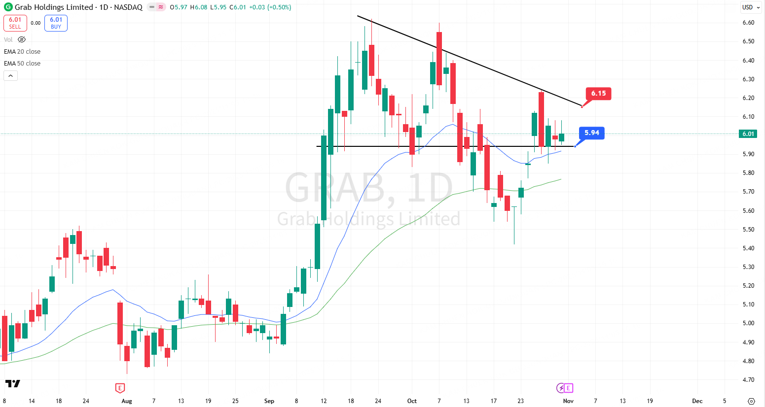 Grab ticked up +0.50% to $6.01 on a tight session (range $5.95–$6.08). Volume 41.95M vs 44.53M avg (~0.94×), a quiet day near the highs.