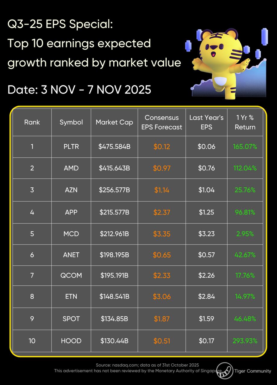 On November 3 to November 7, $Palantir Technologies Inc.(PLTR)$ , $Advanced Micro Devices(AMD)$ , $AstraZeneca PLC(AZN)$ , $AppLovin Corporation(APP)$ , $McDonald's(MCD)$ , $Arista Networks(ANET)$ , $Qualcomm(QCOM)$ , $Eaton Corp PLC(ETN)$ , $Spotify Technology S.A.(SPOT)$ , $Robinhood(HOOD)$ , $Constellation Energy Corp(CEG)$ , $DoorDash, Inc.(DASH)$ , $McKesson(MCK)$ , $Parker Hannifin(PH)$ , $Duke(DUK)$ , $CRH PLC(CRH)$ , $Emerson(EMR)$ , $Airbnb, Inc.(ABNB)$ , $TransDigm(TDG)$ , and $Ferrari NV(RACE)$ are expected to release their earnings, and consensus earnings per share forecasts are higher than data from the same period last year.