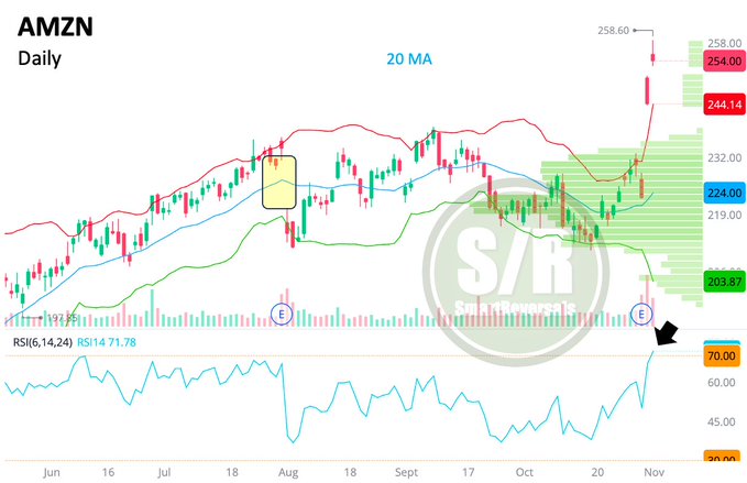 $Amazon.com(AMZN)$ : The red candle from Friday that suggested a gap fill had bullish continuation instead, printing a shooting star with a gap; the RSI crossed 70. A healthy consolidation is likely and needed.