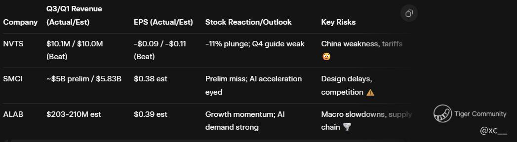 The big question: Is this earnings season cursed by high expectations and global jitters, or will SMCI and ALAB deliver the magic? π From X vibes, traders are split β some betting on upside surprises in AI plays, others wary of repeats like NVTS. With the sector under pressure, strong guidance could propel these stocks higher, but misses might deepen the dip. Stay tuned for post-earnings fireworks! Whatβs your take β buy the dip or sit it out? π¬π₯