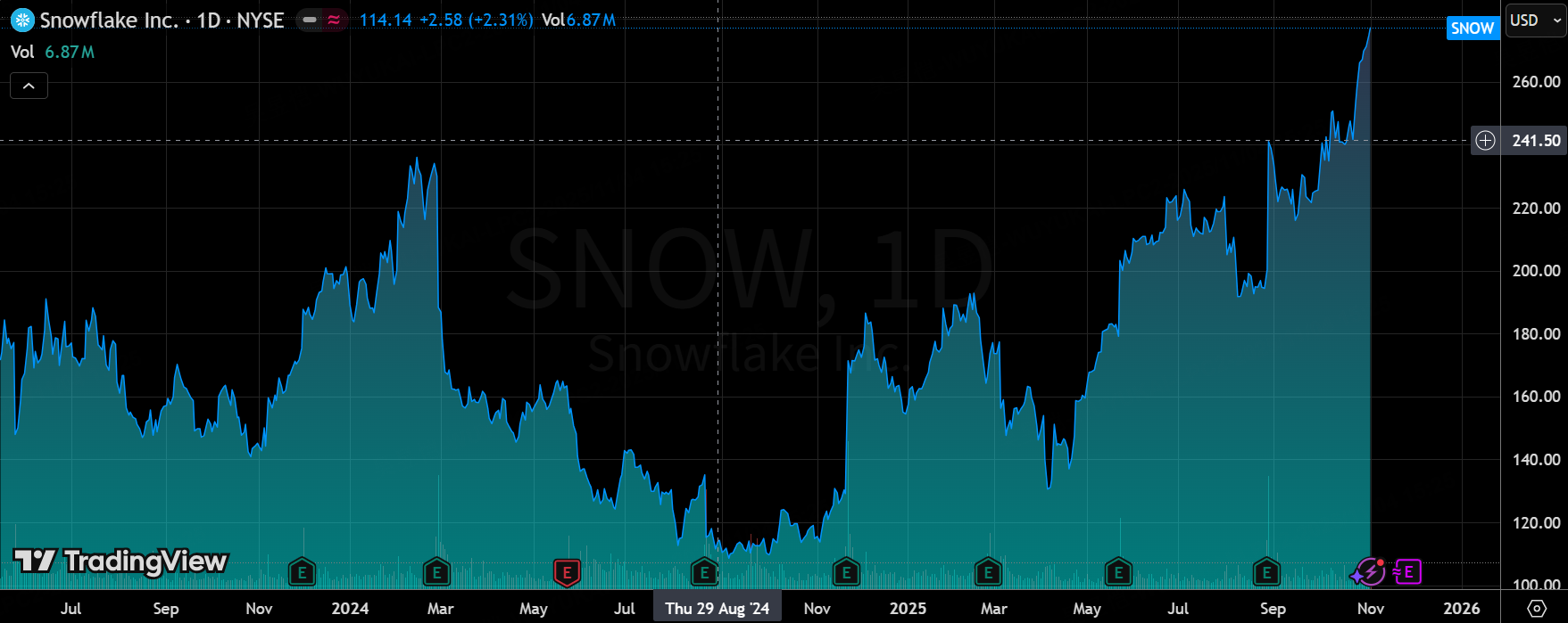 4. $Snowflake(SNOW)$ : Catalyzed by developer conference + AI data demand, hits 52-week high. Short-term catalyst is the "Snowflake BUILD 2025 Developer Conference" (online, Nov. 4-7, 2025), where the market anticipates new AI data processing offerings (e.g., LLM and data cloud integration tools). Active $320 call option trading reflects investor bets on further post-conference stock gains, signaling confidence in its AI data infrastructure leadership. The core concept is the "deep integration of AI and data processing"—AI model training requires accessing vast amounts of dispersed data. Snowflake's data cloud platform enables cross-enterprise, cross-scenario data integration, positioning it as the "data hub" of the AI era. Regardless of Citigroup's base/pessimistic/optimistic scenarios, it maintains competitiveness (even in the pessimistic scenario, hyperscale cloud providers still require its data integration capabilities).