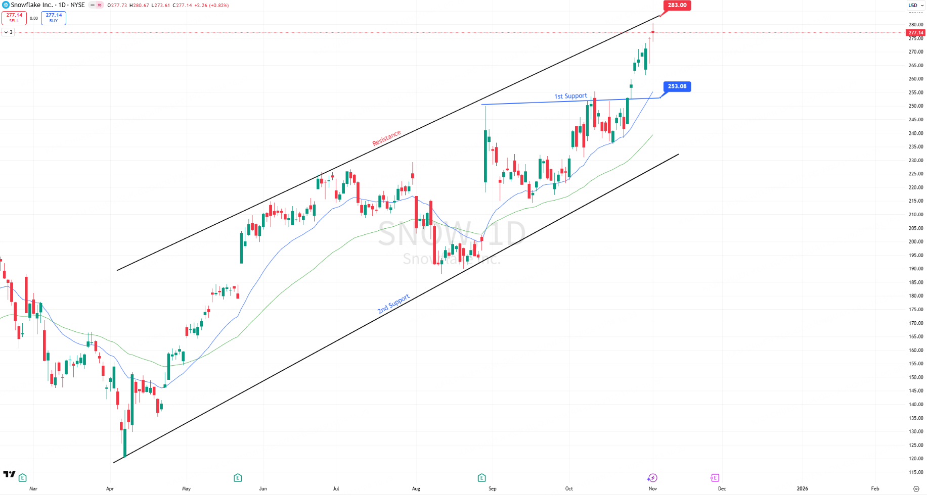 SNOW is a high-beta growth stock, very sensitive to rate expectations and sentiment around cloud/AI spending. Earnings and guidance changes can trigger large gaps that slice through technical levels quickly.