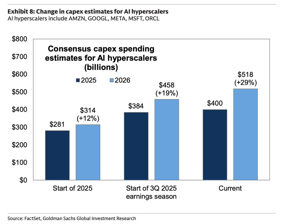Goldman also projects that the five AI giants (AMZN, GOOGL, META, MSFT, ORCL) will increase capital expenditures from $314 billion to $518 billion by 2026, up 65% in just 10 months. But suddenly, investors have pulled back from that 2026 optimism.