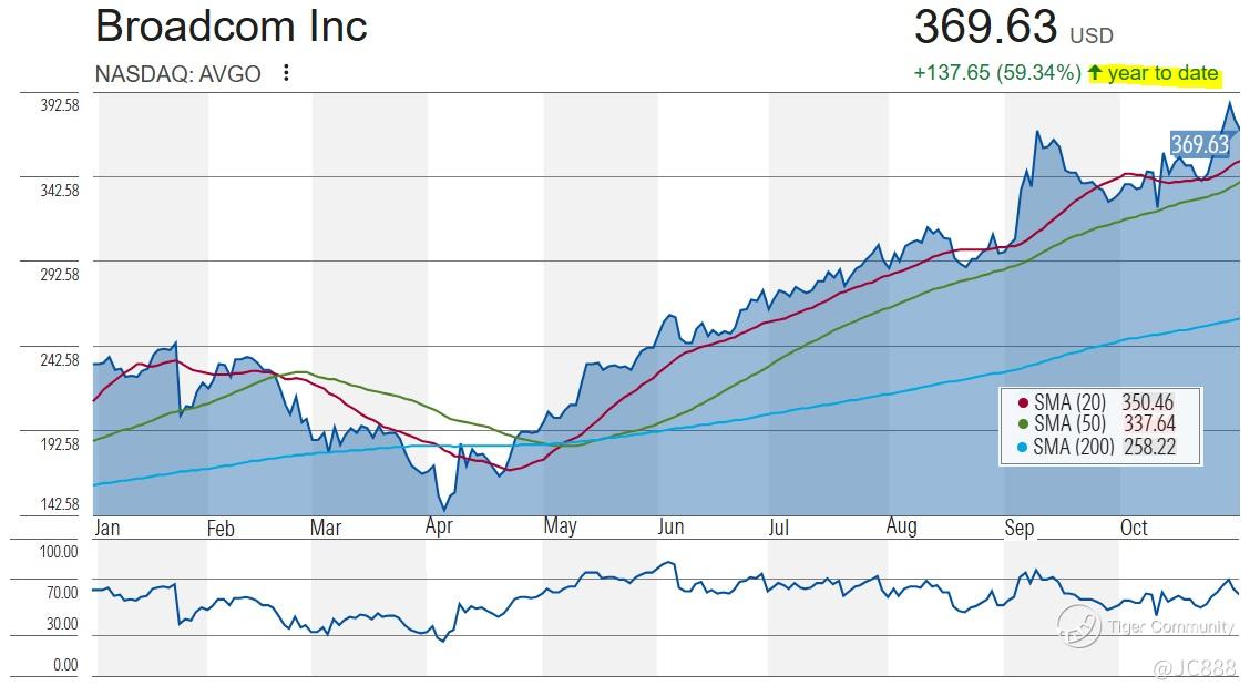 AVGO’s Friday closing price of $369.63 sits above the 3 moving averages, clearly suggesing: