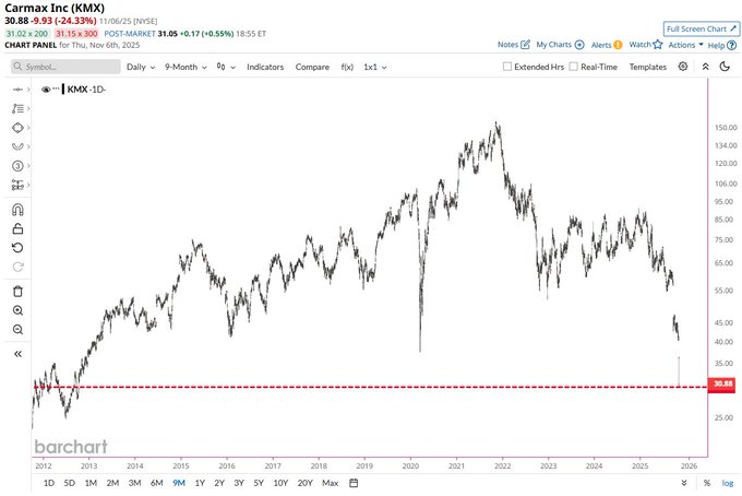 Is KMX done? Now trading at its lowest prices in 13 years and the stock has cratered 80% since its 2021 all-time high 📉📉